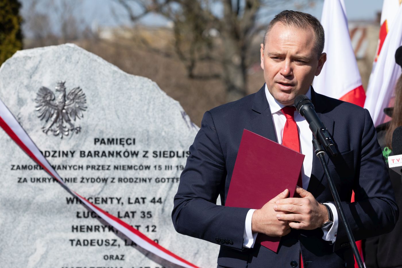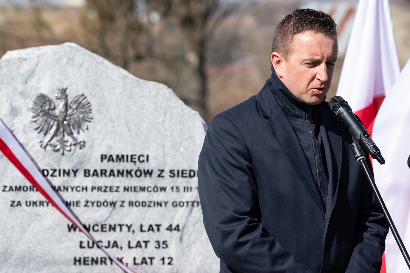 Dr Karol Nawrocki, prezes IPN. Odsłonięcie obelisku upamiętniającego rodzinę Baranków – Miechów, 24 marca 2022. Fot. Mikołaj Bujak (IPN)