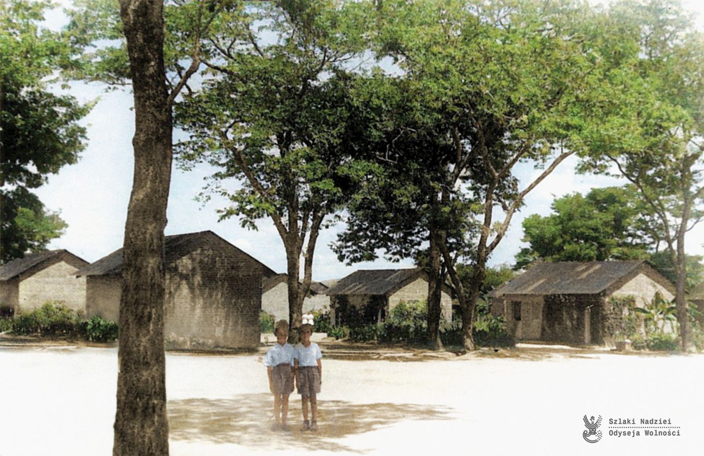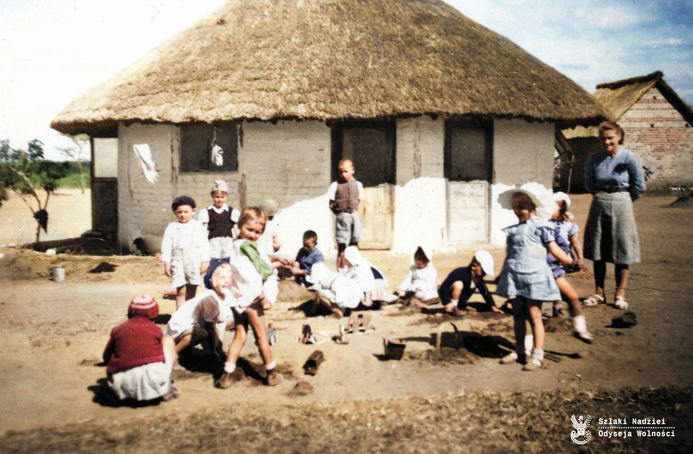 Dzieci podczas zabawy w piasku przed budynkiem przedszkola. Marandellas, Rodezja Południowa (Zimbabwe), 1944 r. (fot. Instytut Polski i Muzeum im. gen. Sikorskiego w Londynie, zdjęcie udostępnione przez Fundację Ośrodka KARTA). Koloryzacja Mikołaj Kaczmarek