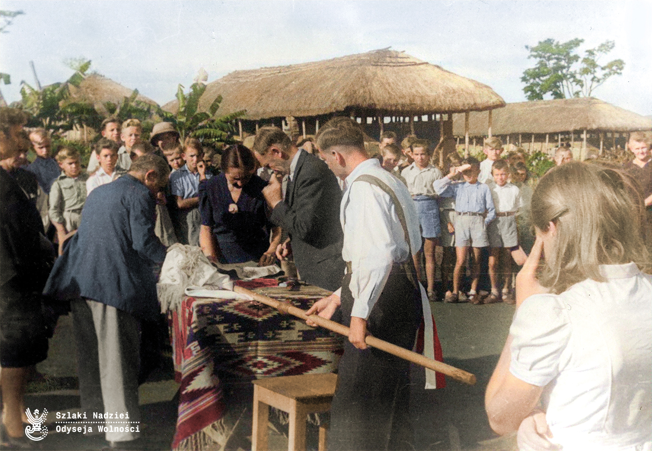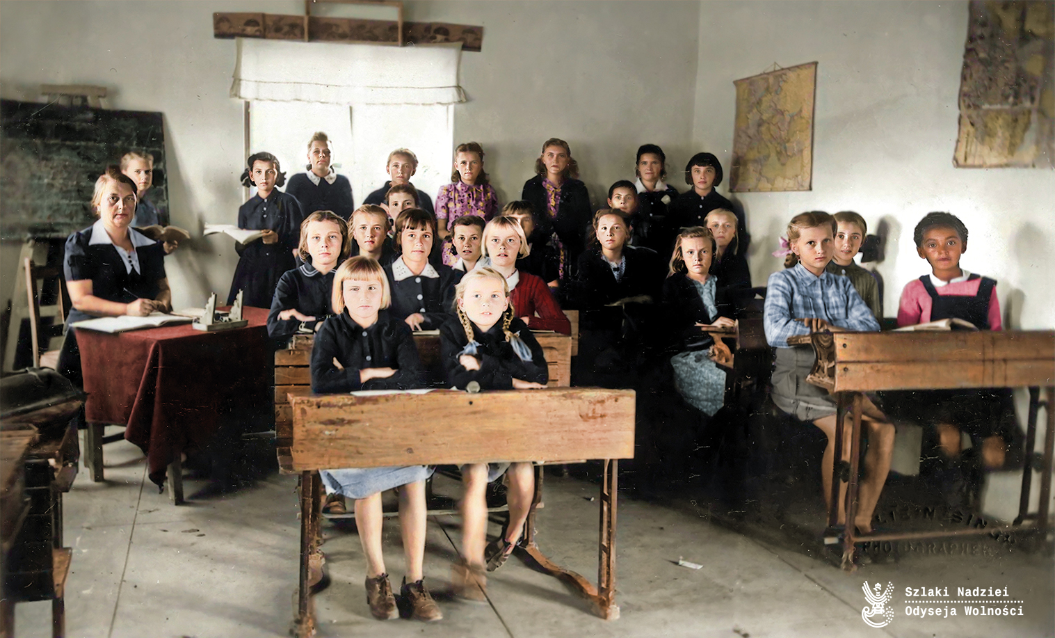 Grupa uczennic szkoły powszechnej z nauczycielką Olgą Jagielnicką. Rusape, Rodezja Południowa (Zimbabwe), ok. 1944 r. Mieszkańcy osiedli starali się prowadzić normalne życie. Dużym osiągnięciem było objęcie opieką szkolną około 8 tys. polskich dzieci. Każde osiedle prowadziło swoją placówkę edukacyjną (fot. Instytut Polski i Muzeum im. gen. Sikorskiego w Londynie, zdjęcie udostępnione przez Fundację Ośrodka KARTA). Koloryzacja: Mikołaj Kaczmarek
