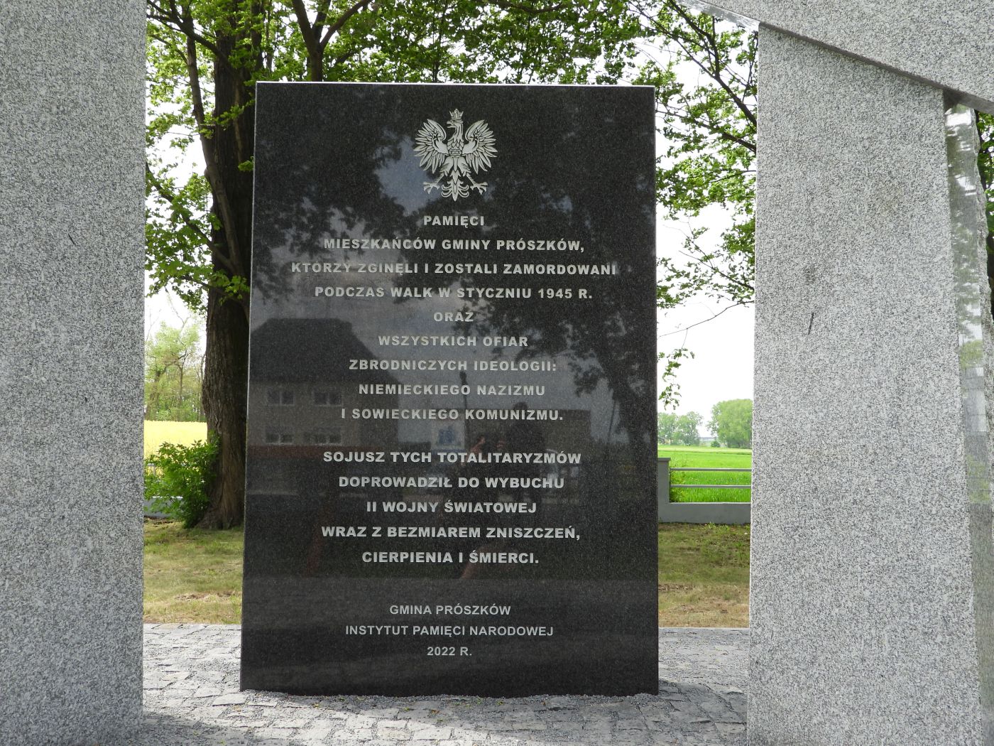 11 maja 2022 roku w Folwarku na terenie gminy Prószków (woj. opolskie) odsłonięty został monument upamiętniający ofiary II wojny światowej. Powstał on w hołdzie mieszkańcom gminy Prószków, którzy zginęli i zostali zamordowani podczas walk w styczniu 1945 r., oraz wszystkim ofiarom niemieckiego nazizmu i rosyjskiego komunizmu. Pomnik, sfinansowany przez IPN, stanął w miejscu wyburzonego 23 marca 2022 r. monumentu ku czci Armii Czerwonej.