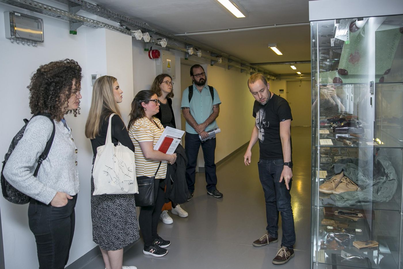 Goście odwiedzili magazyny archiwalne, gdzie mieli okazję zapoznać się z warunkami przechowywania i zabezpieczenia materiałów archiwalnych oraz obejrzeć oryginalne dokumenty z okresu II wojny światowej.