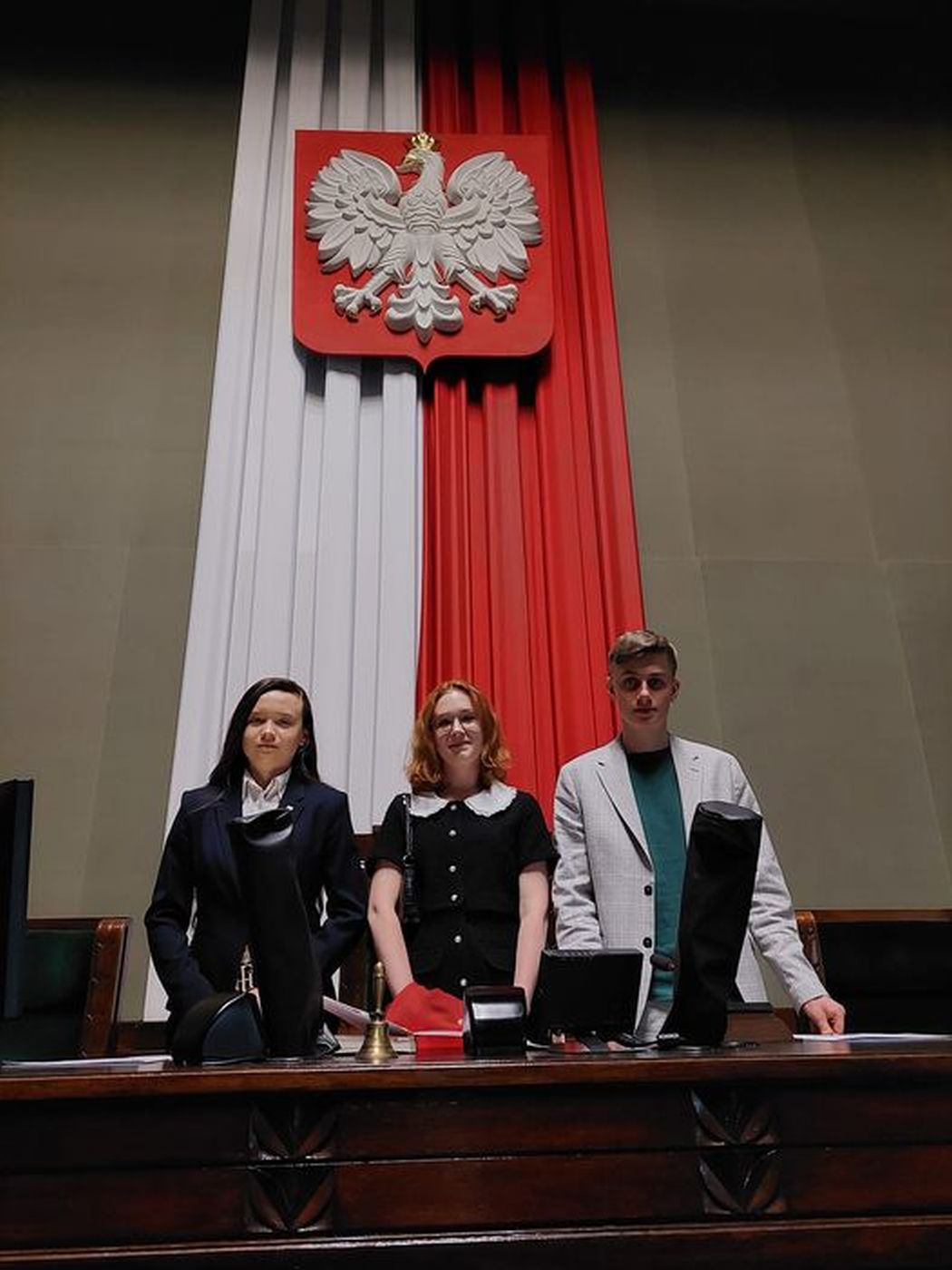 Marszałkowie XXVIII sesji SDiM: Kalina Maciejewska, Wiktoria Mielniczek i Jakub Pach. Fot. Kancelaria Sejmu