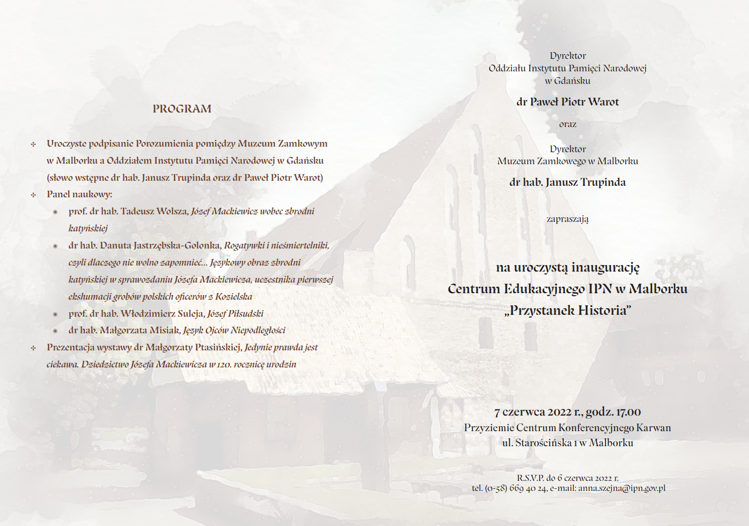 Dyrektor Oddziału Instytutu Pamięci Narodowej w Gdańsku dr Paweł Piotr Warot oraz Dyrektor Muzeum Zamkowego w Malborku dr hab. Janusz Trupinda serdecznie zapraszają na uroczystą inaugurację Centrum Edukacyjnego IPN w Malborku „Przystanek Historia”.