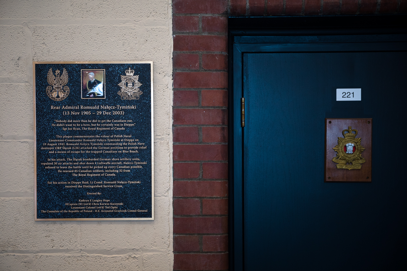 Tablica upamiętniająca kmdr. ppor. Romualda Nałęcz-Tymińskiego w koszarach Royal Regiment of Canada – Toronto, 23 sierpnia 2022. Fot. Sławek Kasper (IPN)