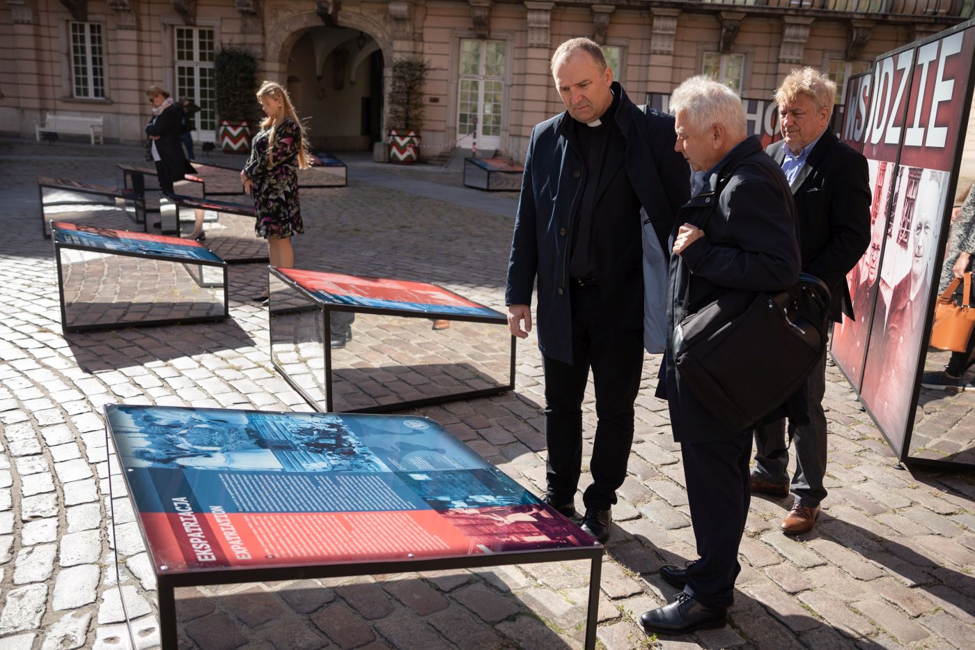 W uroczystym otwarciu wystawy wzięli udział prof. Wojciech Fałkowski, dyrektor Zamku Królewskiego, na którego dziedzińcu można obejrzeć ekspozycję oraz jej autor Adam Hlebowicz, dyrektor Biura Edukacji Narodowej IPN.