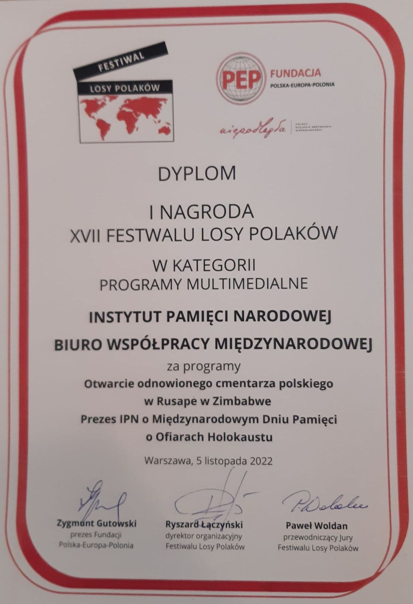 Pierwszą nagrodą w kategorii „programy multimedialne” został uhonorowany Instytut Pamięci Narodowej (Biuro Współpracy Międzynarodowej IPN) za cykl „Ocalić od zapomnienia” i całokształt działalności związanej z tym cyklem. W szczególności wyróżnione zostały filmy „Otwarcie odnowionego Polskiego Cmentarza w Rusape w Zimbabwe” (w ramach flagowego projektu IPN ,„Szlaki Nadziei, Odyseja Wolności”) oraz ,,Prezes IPN o Międzynarodowym Dniu Pamięci o Ofiarach Holokaustu”. Nagrodę w imieniu Agnieszki Jędrzak, dyrektor Biura Współpracy Międzynarodowej IPN, odebrali przedstawiciele BWM – naczelnik Wydziału Kontaktów Międzynarodowych Joanna Kumor oraz Sławomir Bardski.