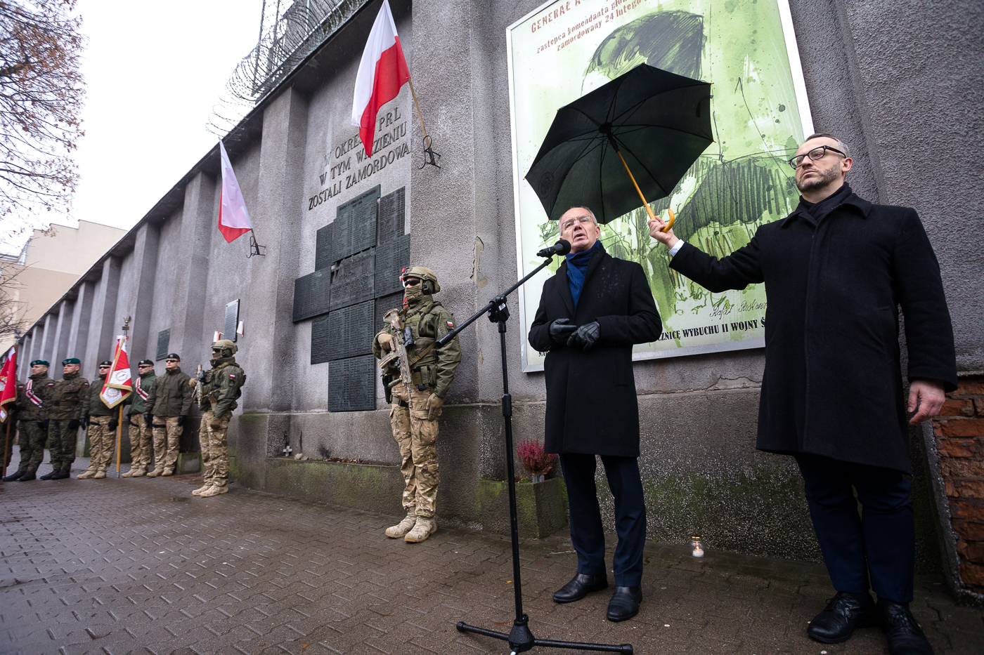 – Za tym murem, w podziemiach głównego pawilonu zamordowano polskiego bohatera, legionistę, dowódcę Kedywu. Gdyby żył w wolnej Polsce, dostąpiłby najwyższych honorów. W Polsce zniewolonej przez Sowietów zamiast honoru i chwały spotkały go cierpienie i śmierć. Zamiast generalskiego munduru – więzienne łachmany. Zamiast należnych pochwał – haniebne i bolesne o wydaniu wyroku śmierci, o wymiarze kary dla „hitlerowsko-faszystowskich zbrodniarzy”