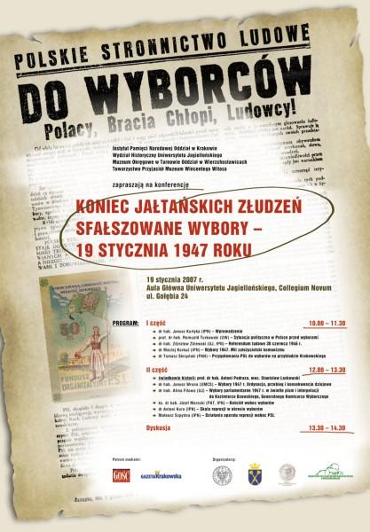 19 stycznia 2007 r., w sześćdziesiątą rocznicę wyborów 1947 r., w auli Collegium Novum Uniwersytetu Jagiellońskiego odbyła się sesja historyczna „Koniec jałtańskich złudzeń. Sfałszowane wybory 19 stycznia 1947 r.”, zorganizowana przez Instytut Pamięci Narodowej Oddział w Krakowie, Wydział Historyczny UJ, Muzeum Okręgowe w Tarnowie Oddział w Wierzchosławicach oraz Towarzystwo Przyjaciół Muzeum Wincentego Witosa.
