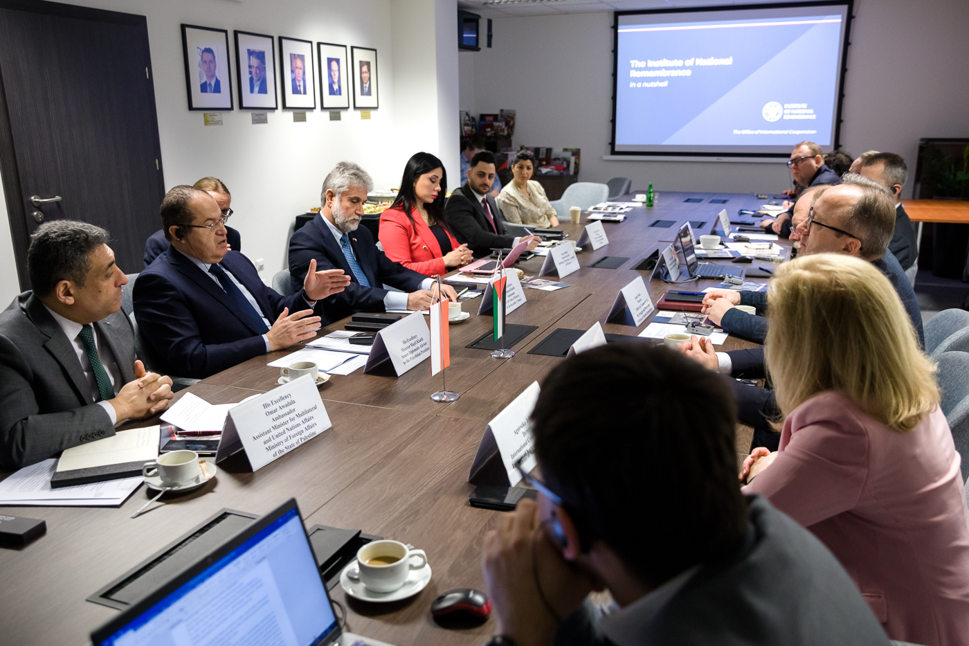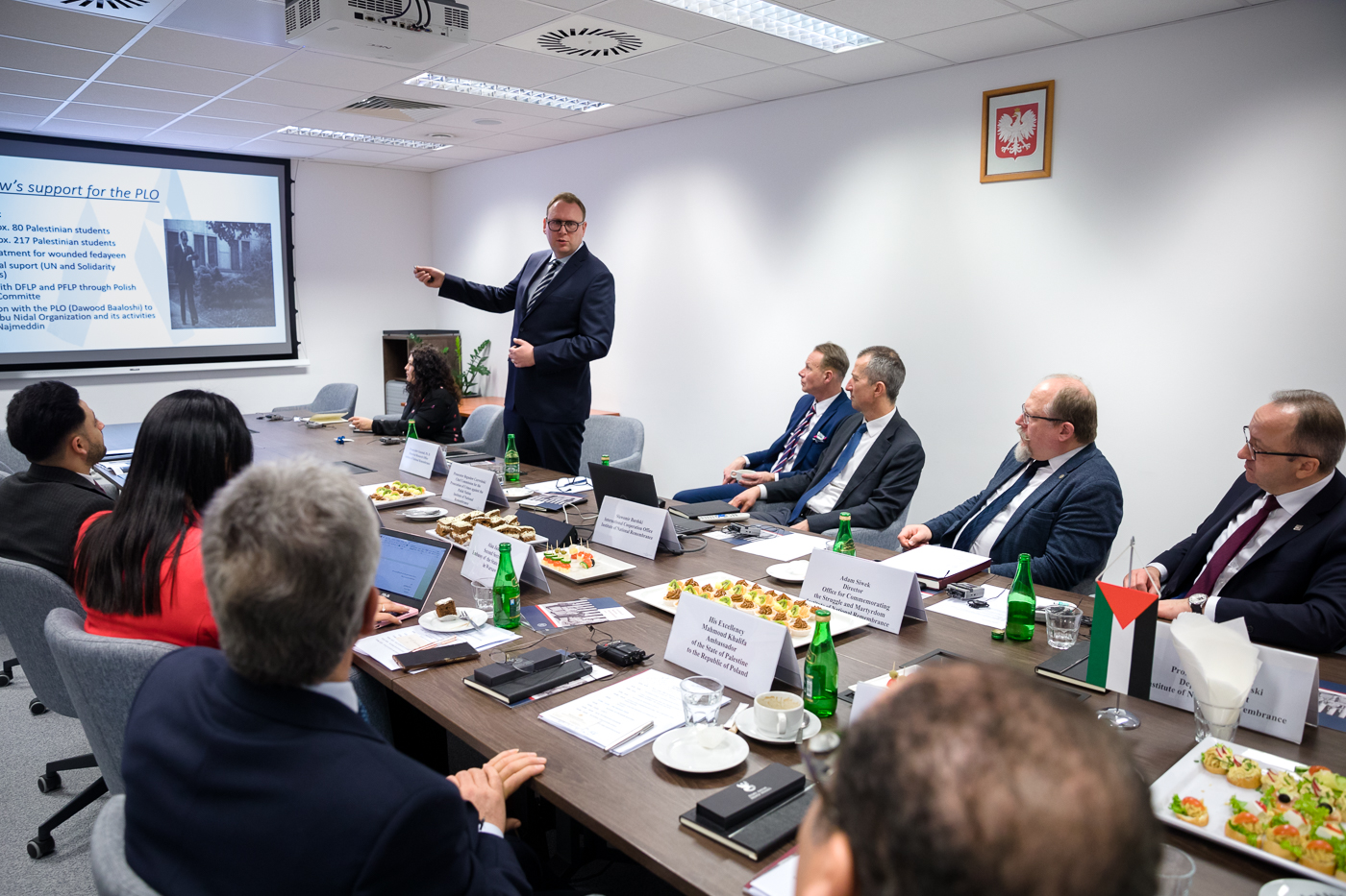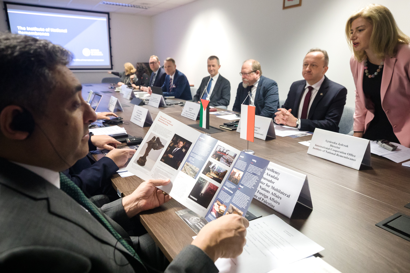 W spotkaniu w IPN uczestniczyli Majdi Khaldi, Minister, doradca Prezydenta Palestyny ds. dyplomatycznych, Jego Ekscelencja Omar Awadala, Ambasador, Asystent Ministra ds. Wielostronnych i Narodów Zjednoczonych w Ministerstwie Spraw Zagranicznych Palestyny, Jego Ekscelencja Mahmoud Khalifa, Ambasador Państwa Palestyny w Polsce, Alaa Jadallah, II sekretarz Ambasady Państwa Palestyny w Polsce i Ammar Shayeb, dyrektor Biura Ambasady Państwa Palestyny w Polsce.
