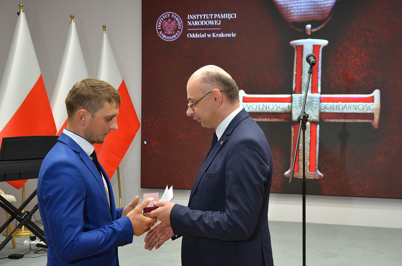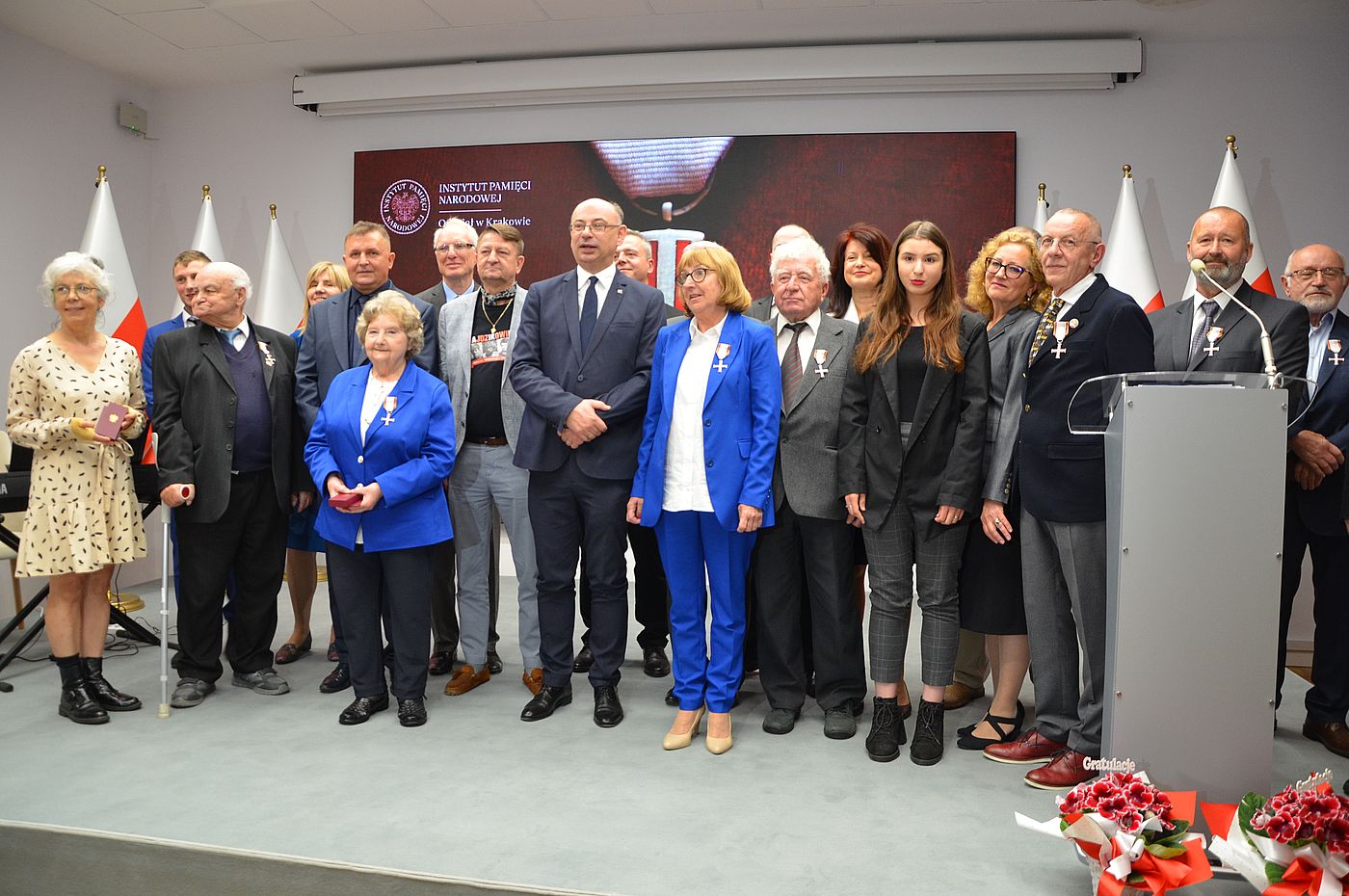 – To piękne odznaczenie nawiązuje do Krzyża Niepodległości, który był przyznawany w II Rzeczpospolitej za udział w odzyskaniu niepodległości i za walkę w jej obronie. Tym samym jesteście Państwo kolejnym pokoleniem, które walczyło o Polskę. Oni walczyli z bronią w ręku, często ginęli, Państwo funkcjonowali w trochę innej rzeczywistości, może nie tak brutalnej, ale trzeba to podkreślić, że była dla Polski, dla Was, niebezpieczna. To nie tylko internowania, groźby utraty pracy, szykany, ale również i możliwość utraty życia. (...) Wszystkich Was łączyła chęć życia w wolnej, niepodległej Polsce. (...). Dzięki Wam żyjemy w wolnej Rzeczypospolitej. I za to dziś Polska Wam dziękuje w sposób symboliczny poprzez te Krzyże Wolności i Solidarności.(...) – zwrócił się do odznaczonych prezes Szpytma. Nawiązując do dzisiejszego Dnia Matki, dodał: – Chciałbym podziękować wszystkim bliskim z Waszych rodzin. Matkom, ojcom, a czasami rodzeństwu, dzieciom, za to wspieranie Was w działalności. Mogliście liczyć na to wsparcie, bez którego byłoby Wam bardzo trudno funkcjonować. To wyróżnienie jest również dla Waszych bliskich. I proszę, byście zadbali o to, by kolejne pokolenia kochały Polskę tak jak Wy.