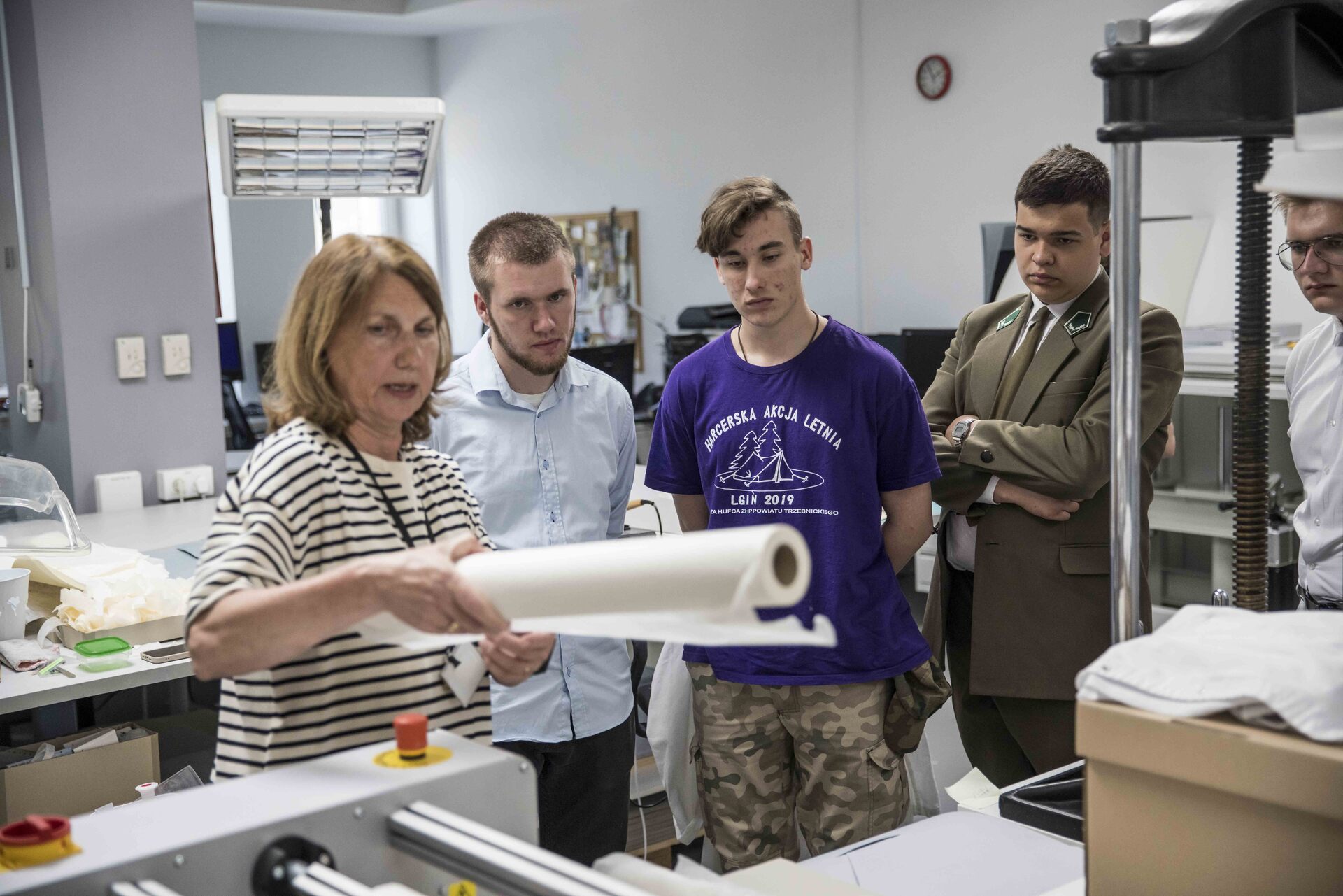 Następnie laureaci zwiedzili magazyny archiwalne i kartoteczne, gdzie mogli zobaczyć jakiego rodzaju dokumenty przechowywane są w zbiorach Instytutu i dowiedzieć się o zasadach prowadzenia pracy operacyjnej przez służby specjalne PRL. Natomiast w pracowniach konserwacji dokumentów i digitalizacji akt zobaczyli, w jaki sposób zabezpieczamy dokumenty archiwalne.