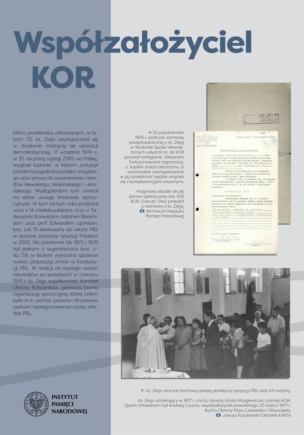 Biograficzna wystawa elementarna przygotowana przez Oddziałowe Biuro Edukacji Narodowej Instytutu Pamięci Narodowej w Łodzi prezentuje postać ks. Jana Ziei.