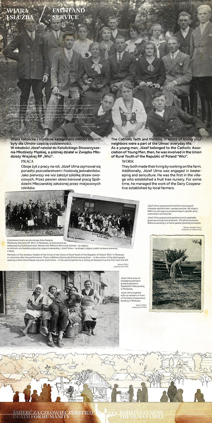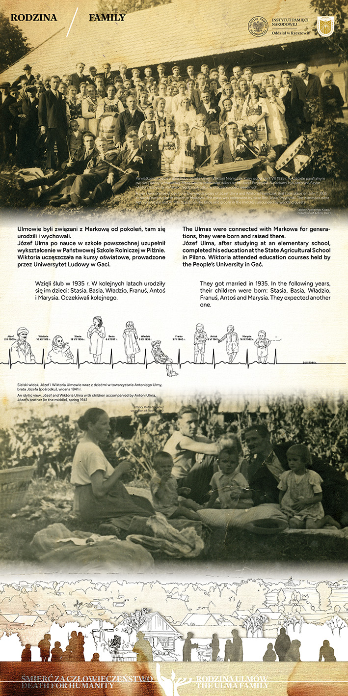 Wystawa, przygotowana przez Oddział Instytutu Pamięci Narodowej w Rzeszowie, przedstawia losy, wydawałoby się zwykłej polskiej rodziny, a przecież jednocześnie wyjątkowej. Rodziny, której linia życia została poddana trybom okrutnej wojny i okupacji. Józef i Wiktoria Ulmowie nie poddali się biernie biegowi historii. Stali się jej aktywnymi uczestnikami, dostrzegając innych ludzi, którym należało udzielić pomocy. Stanęli po stronie dobra i sami dzielili się tym dobrem z innymi. Narodowość, wyznanie, różnice kulturowe, w obliczu terroru niemieckiej okupacji, stały się nieistotne, wagi nabrało człowieczeństwo. Pragnąc ochronić życie, sami je stracili.