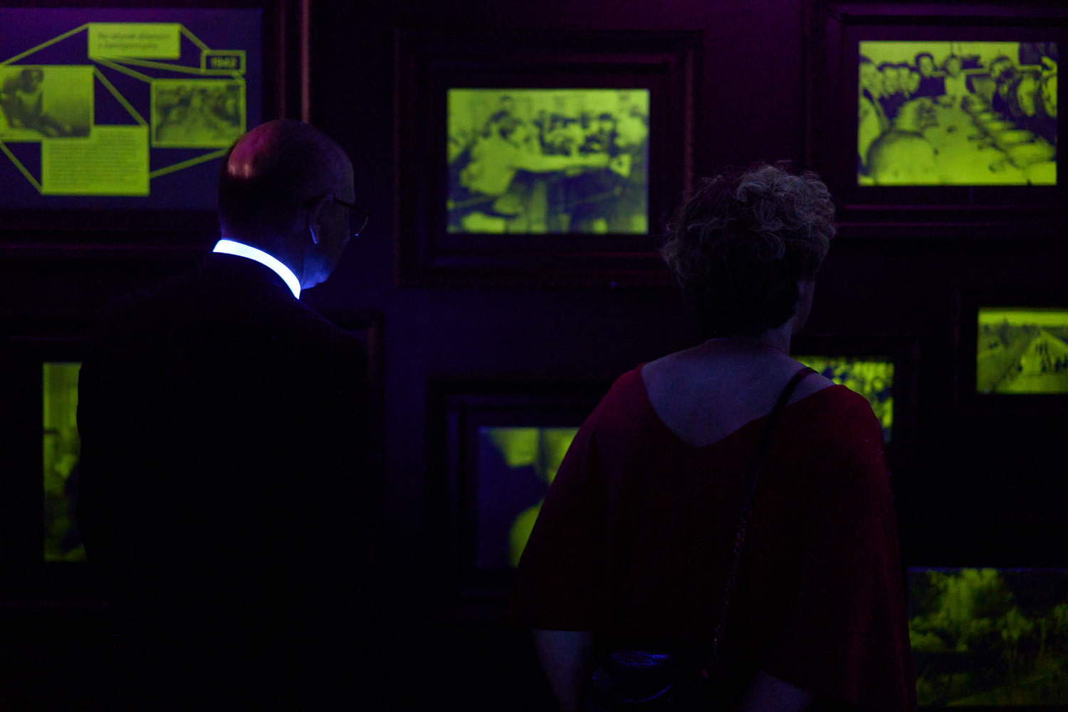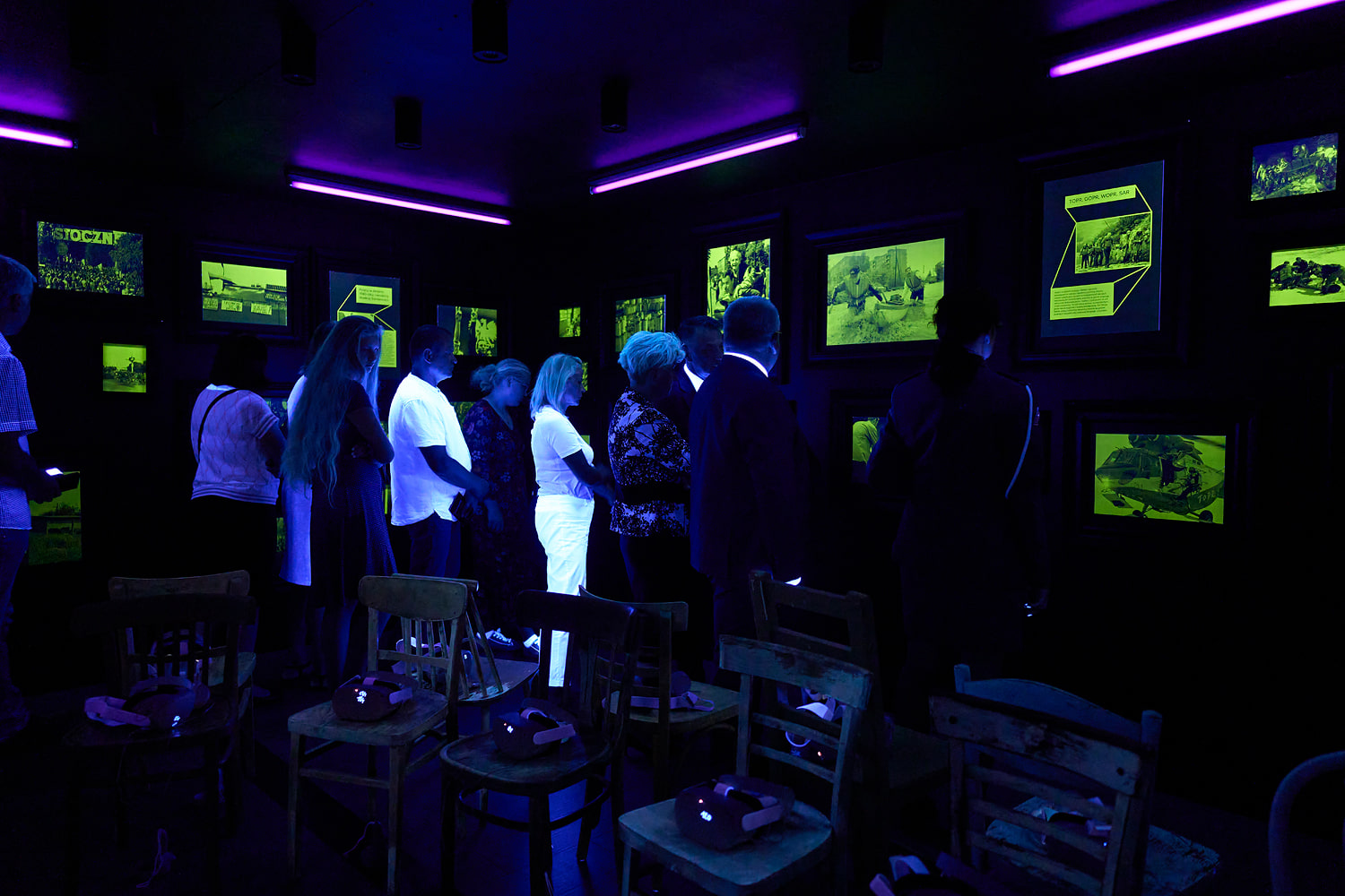 Nieprzypadkowo po zdjęciu gogli, oczom zwiedzających ukazują się – niewidoczne wcześniej – eksponaty, skąpane w świetle ultrafioletu. To co czarne – staje się kolorowe, to co puste – przybiera formę, budując nadzieję, budząc emocje, rozpalając wyobraźnię. Na ścianach widzimy fotografie z różnych okresów, daty, miejsca, nazwiska, hasła – obrazujące przywoływane wydarzenia i przykłady niesienia pomocy potrzebującym.