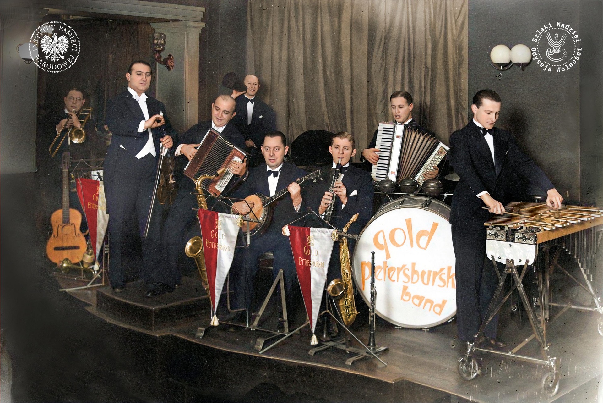 Jerzy Petersburski pochodził z warszawskiej rodziny muzyków żydowskich. Podczas II wojny światowej znalazł się na terenie ZSRS, skąd wraz z Polską Armią pod dowództwem gen. Władysława Andersa przedostał się na Bliski Wschód. W Kairze prowadził audycje radiowe dla polskich żołnierzy. W latach 1947–1967 tworzył w Ameryce Południowej (Argentyna, Brazylia, Wenezuela). W 1967 r. wrócił do Polski. Na zdjęciu zespół muzyki tanecznej Artura Golda i Jerzego Petersburskiego (trzeci z lewej) podczas występu, Warszawa, lata 1922–1939 (fot. NAC)