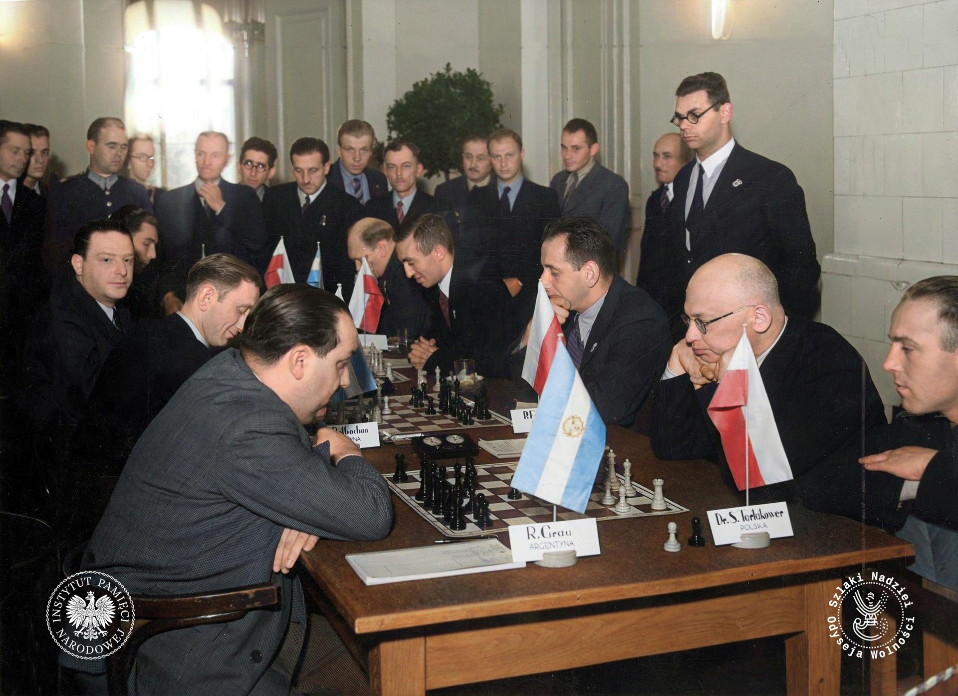 Olimpiada szachowa o Puchar Hamilton-Russell w Warszawie. Mecz szachowy Polska–Argentyna. Widoczni z prawej strony stołu szachiści polscy Ksawery Tartakower (drugi z prawej), Paulin Frydman (trzeci z prawej), Mieczysław Najdorf (czwarty z prawej), z lewej strony stołu widoczni szachiści argentyńscy Roberto Grau (pierwszy z lewej), Jul Bolbochan (drugi z lewej), Pleci (trzeci z lewej), Warszawa 1935 r. (fot. NAC)