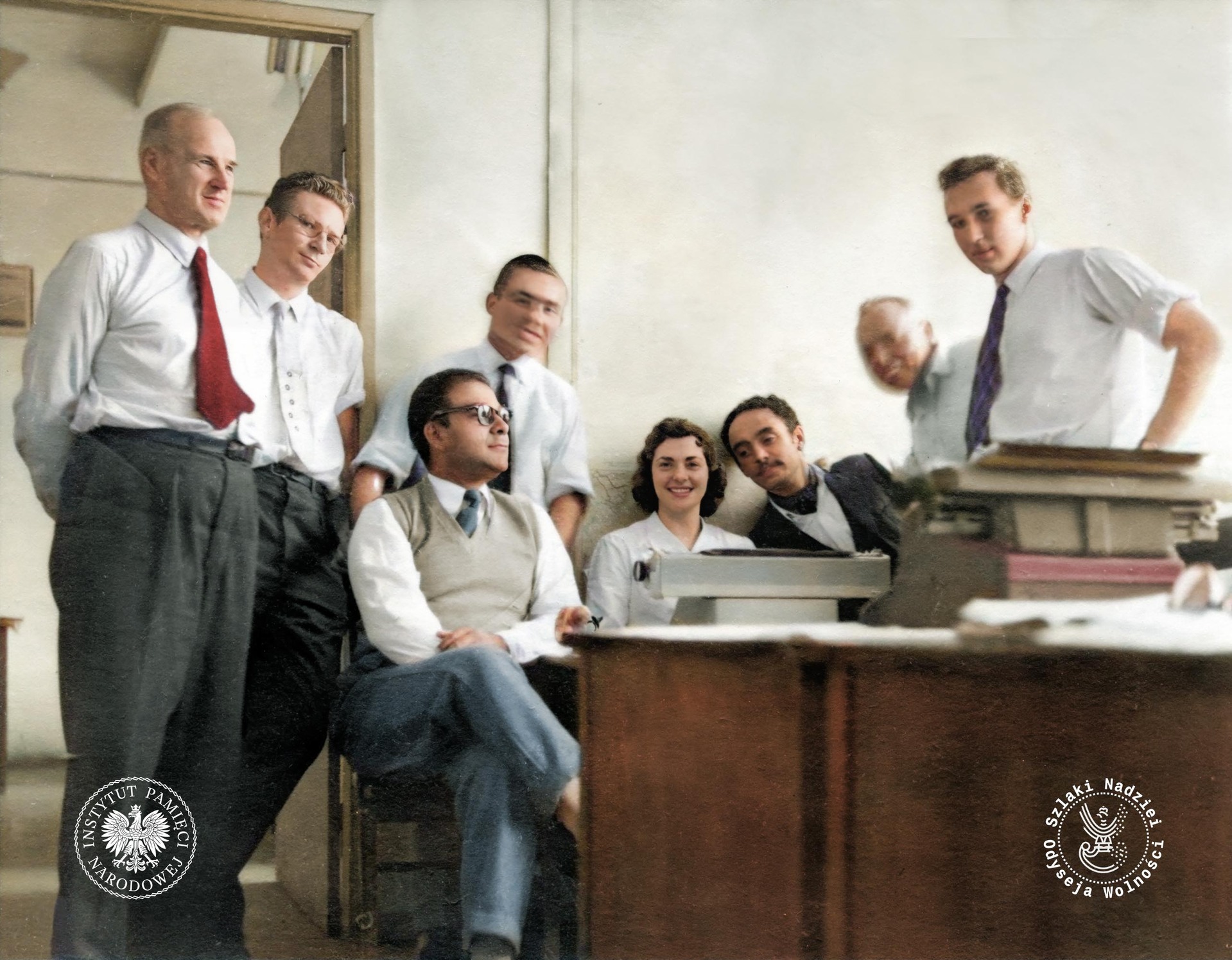 Jerzy Zawisza (pierwszy z lewej) w biurze, Argentyna, lata 60. XX w., (fot. zbiory Archiwum Ojców Franciszkanów w Polskiej Misji Katolickiej w Martin Coronado, zdjęcie udostępnione przez Fundację Ośrodka KARTA)