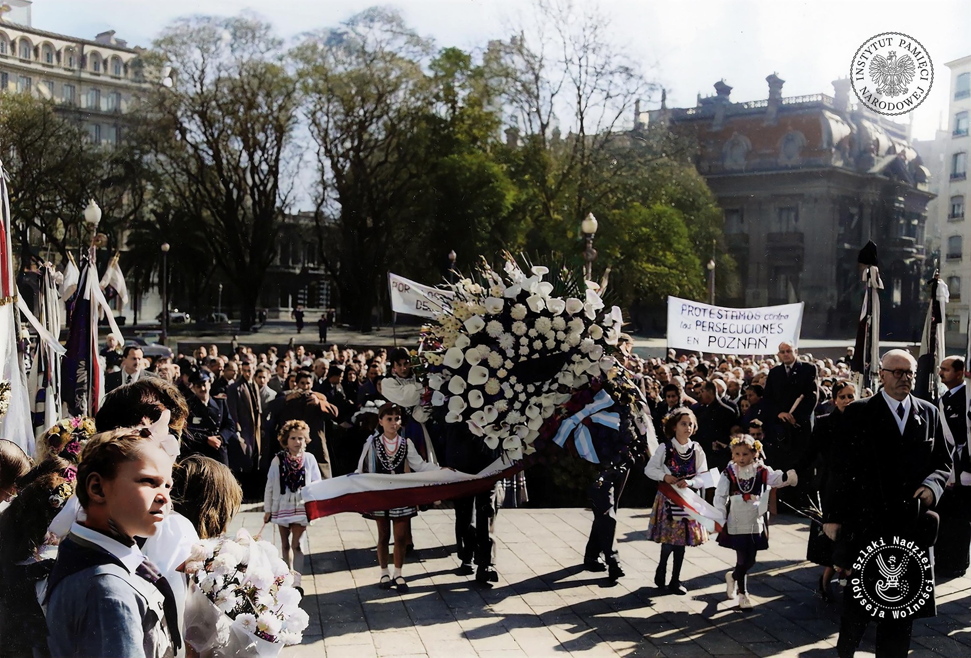 Demonstracja argentyńskiej Polonii zorganizowana w odpowiedzi na brutalne stłumienie przez komunistyczne władze protestów robotników w Poznaniu w czerwcu 1956 r. Buenos Aires, Argentyna, 1956 r. (fot. Alvi, zbiory Biblioteki Polskiej im. Ignacego Domeyki w Buenos Aires, zdjęcie udostępnione przez Fundację Ośrodka KARTA)