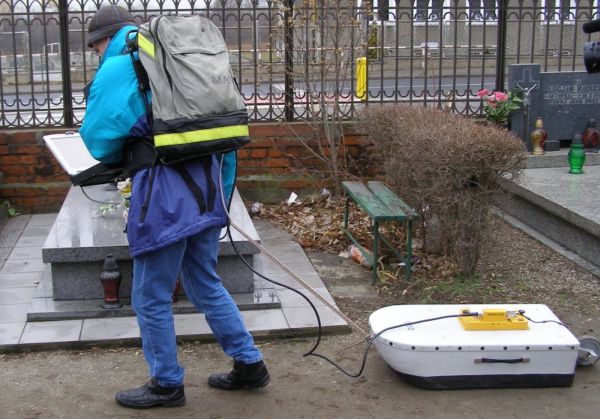 Dr Adam Szynkiewicz z Uniwersytetu Wrocławskiego bada georadarem teren na cmentarzu w Dzierżoniowie -