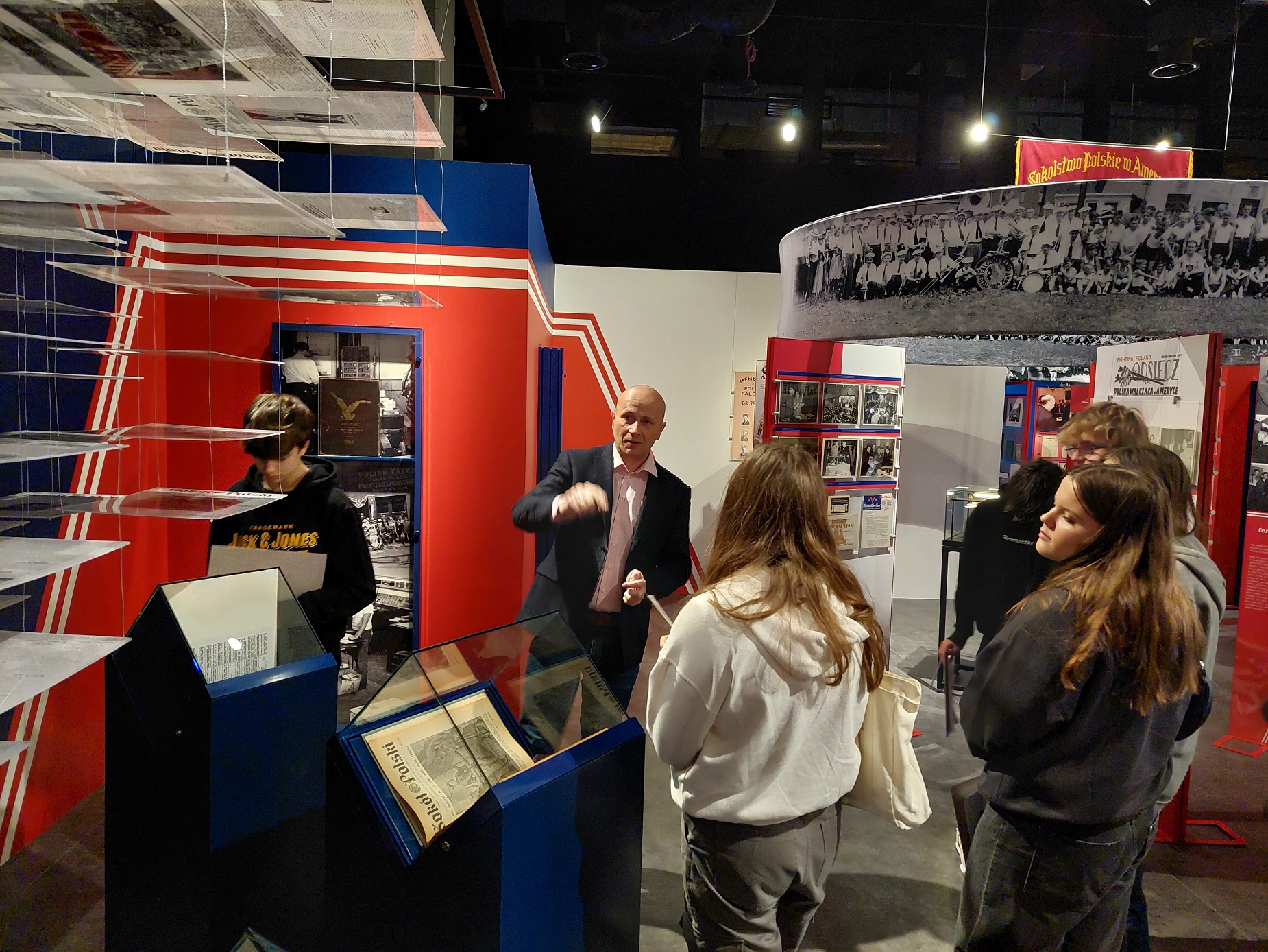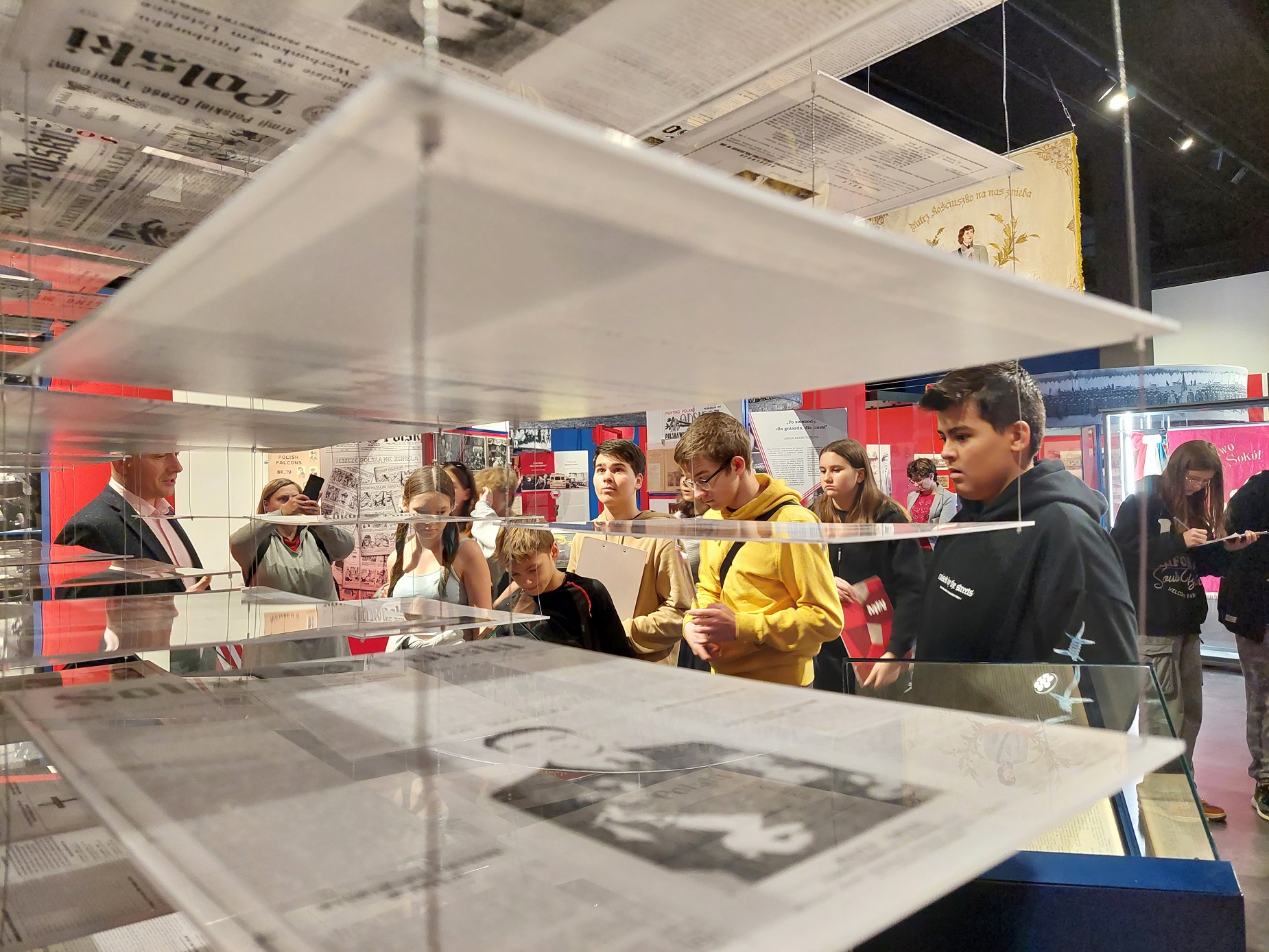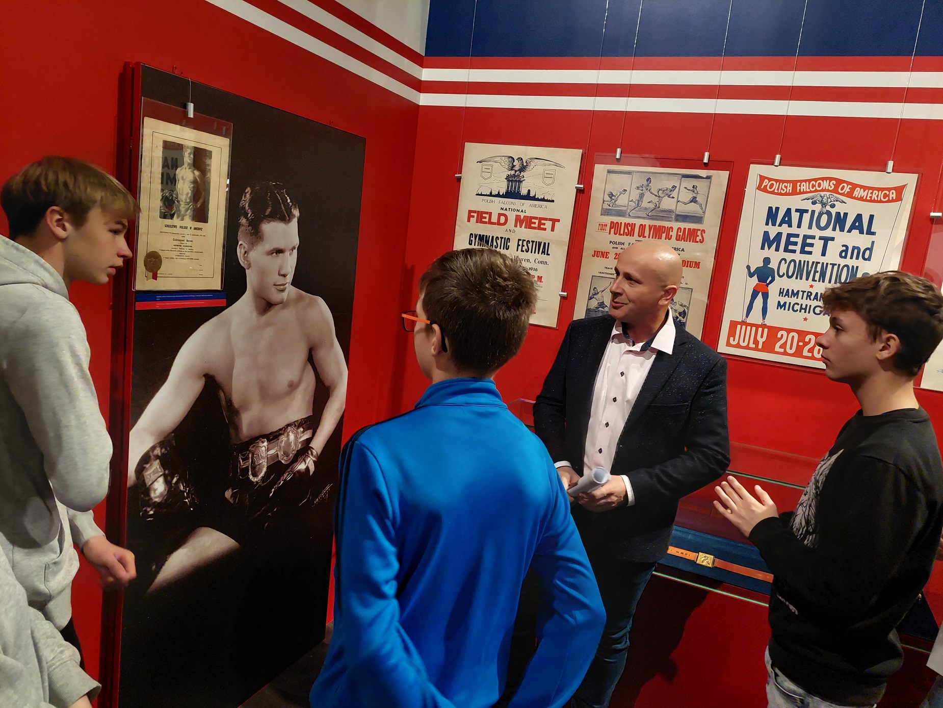 Podczas pierwszej części zajęć uczniowie zwiedzili przygotowaną przez Archiwum IPN wystawę „»Ramię krzep – Ojczyźnie służ«. 135 rocznica powstania Sokolstwa Polskiego w Ameryce”, dowiedzieli się o zasługach tej organizacji polonijnej dla odzyskania przez Polskę niepodległości w 1918 r., a także o związkach łączących Ignacego i Helenę Paderewskich z Sokolstwem oraz poznali wybitnych sportowców wywodzących się z ruchu sokolego. Przewodnikiem po ekspozycji był kurator wystawy Grzegorz Trzyna.