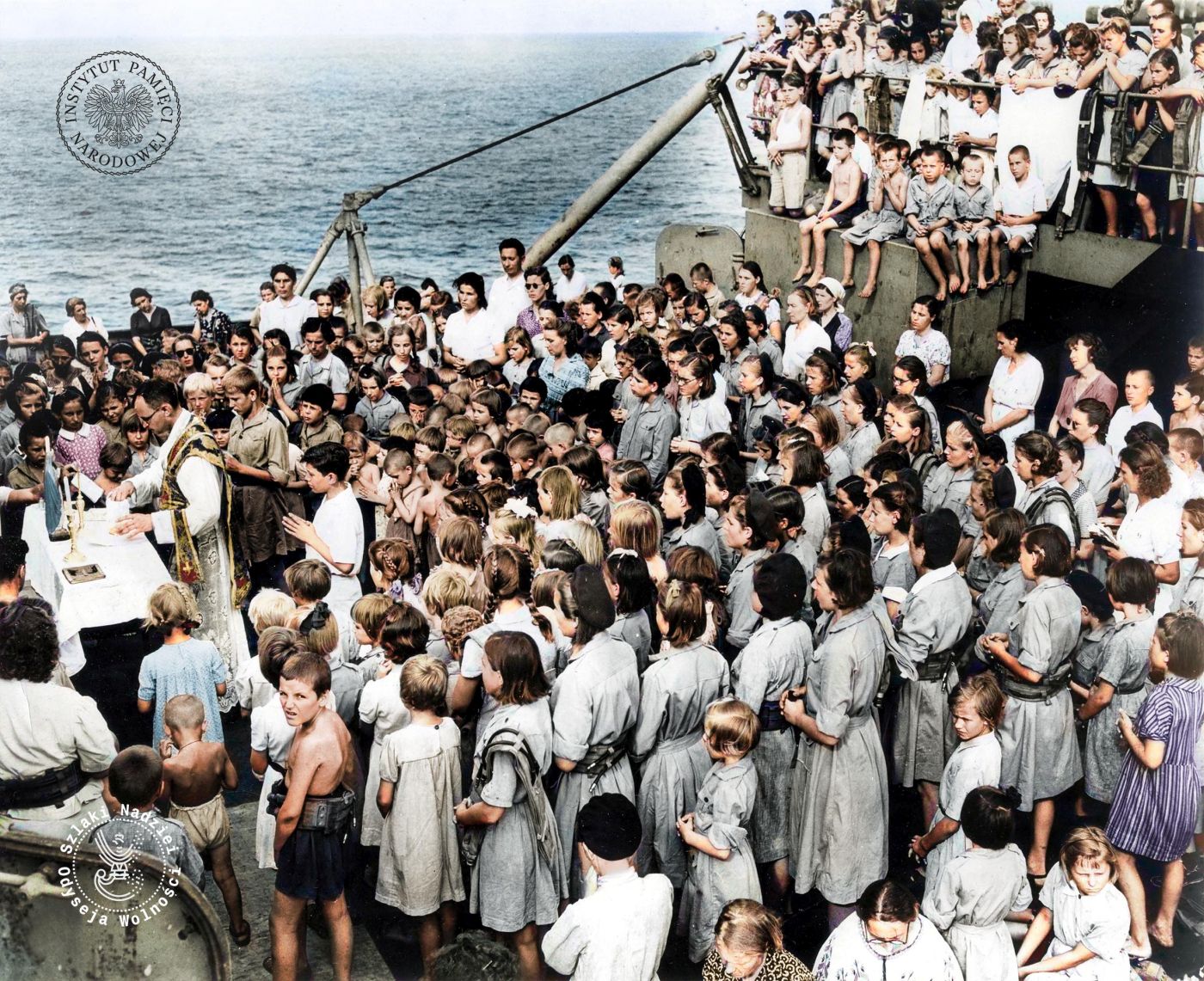 Msza święta na pokładzie USS „Hermitage” z udziałem dzieci polskich, Ocean Indyjski,1943 r. (fot. Instytut Józefa Piłsudskiego w Ameryce)