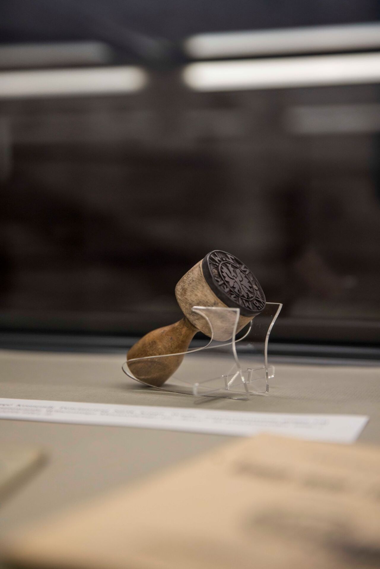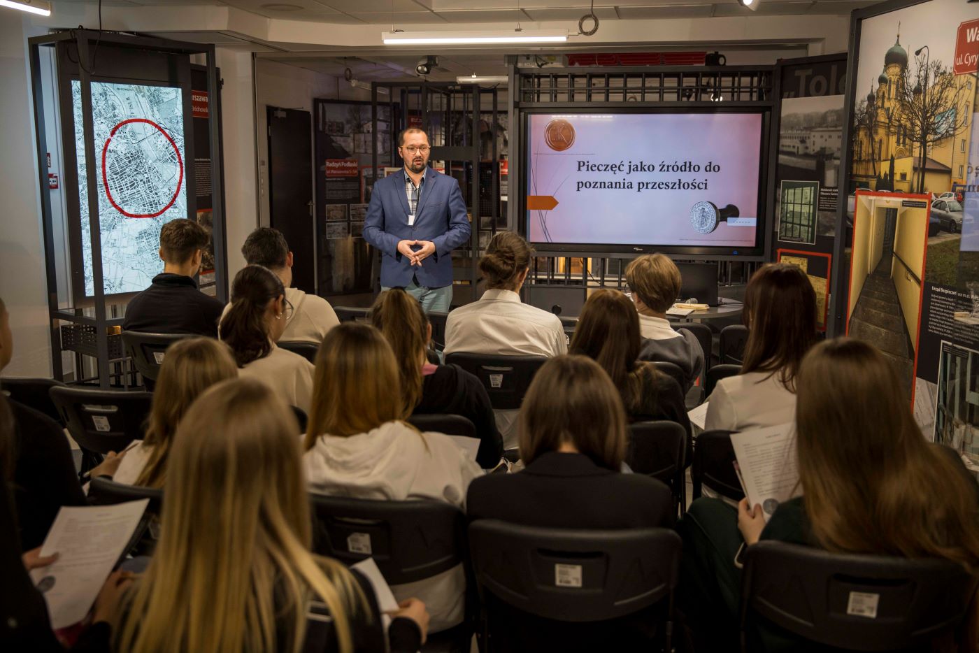 Następnie odbyła się lekcja archiwalna nt. „Pieczęć jako źródło do poznania przeszłości” przeprowadzona przez Rafała Borkowskiego z Izby Pamięci Strzelecka 8. Scenariusz zajęć przygotowany został w oparciu o prezentowane na wystawie artefakty.