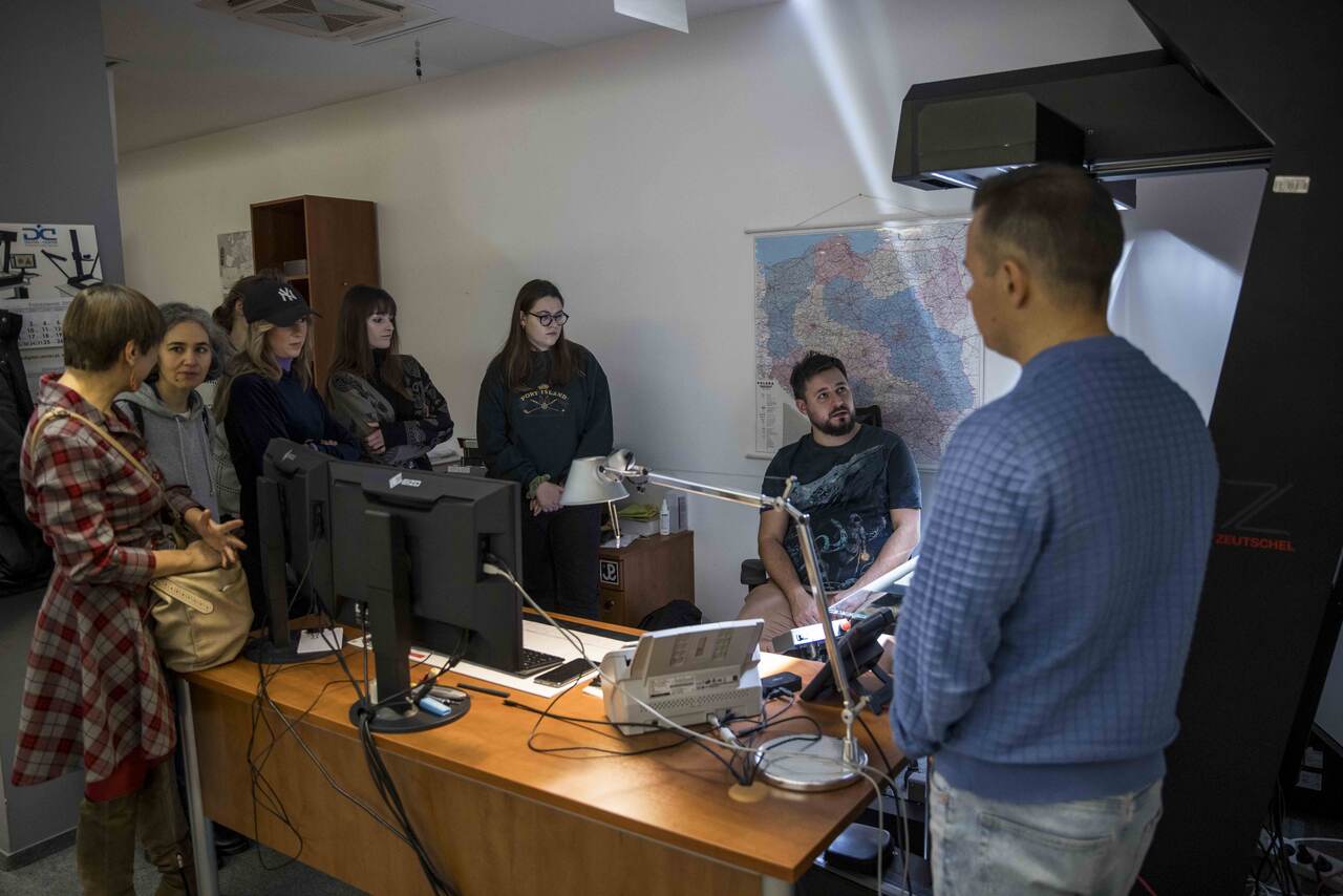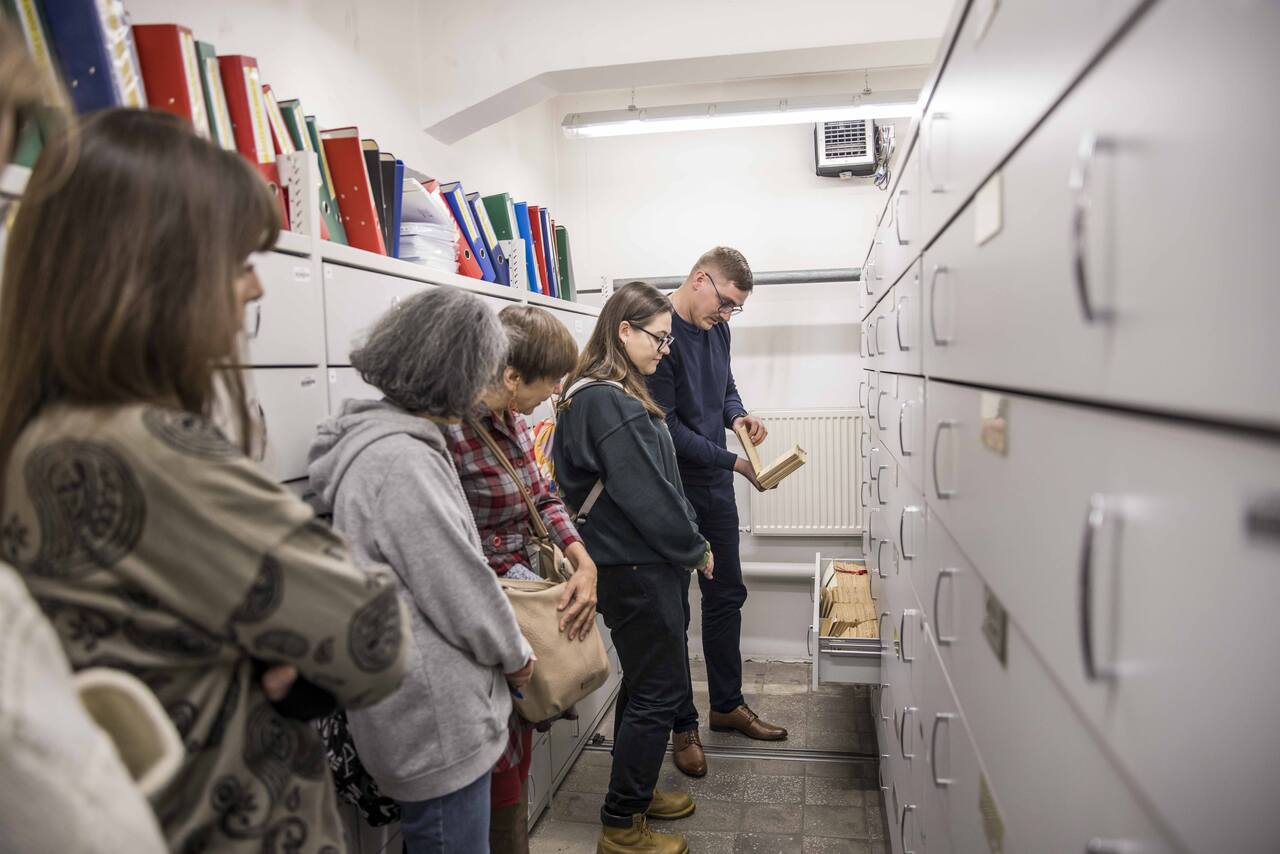 Nasi goście zapoznali się z warunkami przechowywania i zabezpieczania materiałów w pracowniach konserwacji i digitalizacji dokumentów oraz odwiedzili magazyny archiwalne, gdzie obejrzeli akta paszportowe emigracji żydowskiej z lat 1948-1951.