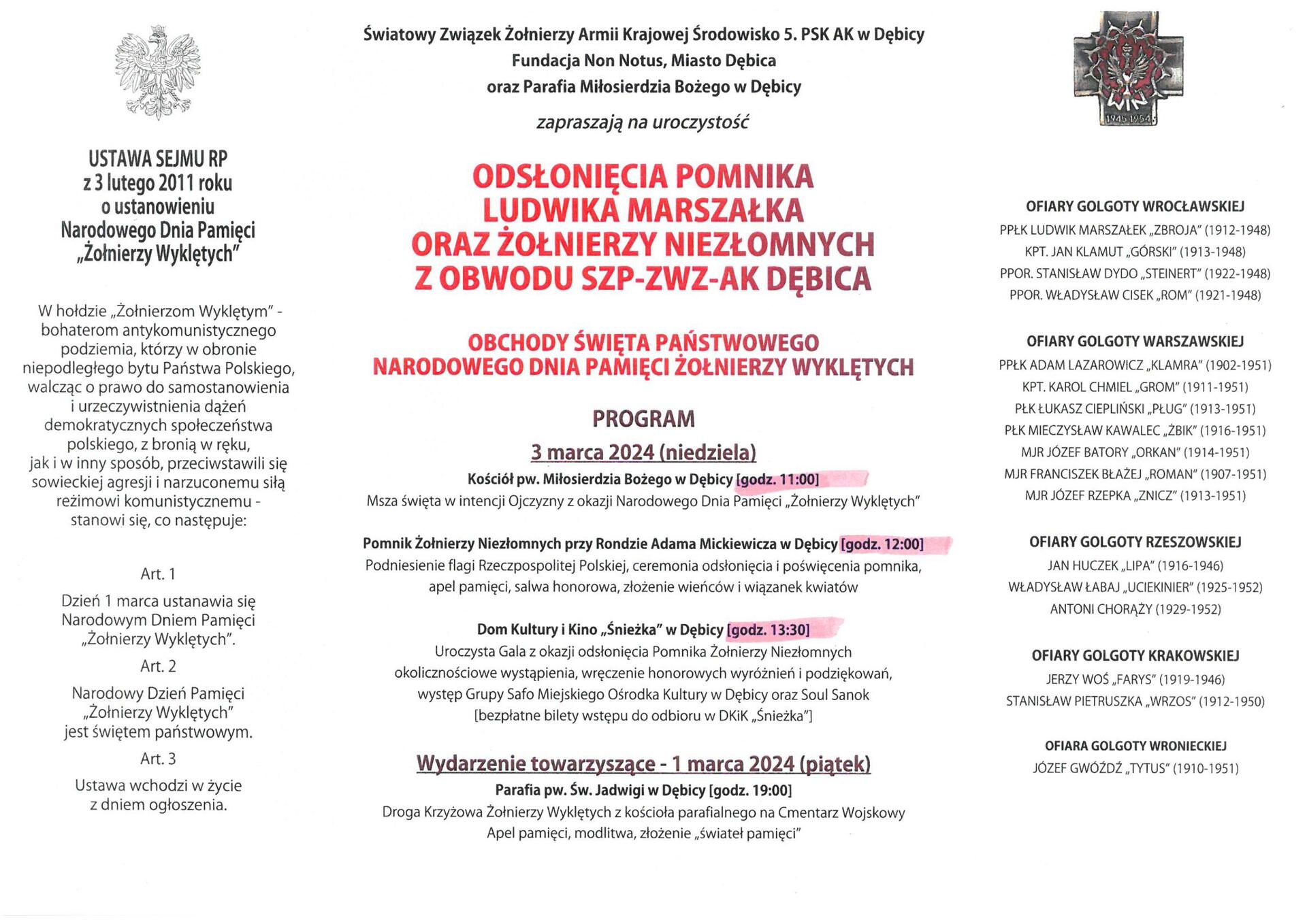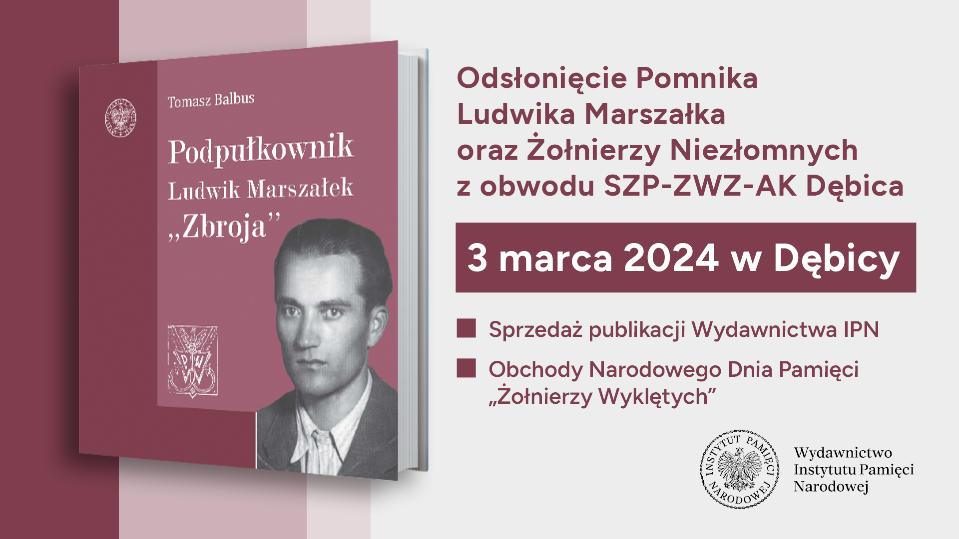 3 marca 2024 r. w Dębicy odbędzie się odsłonięcie pomnika Ludwika Marszałka oraz Żołnierzy Niezłomnych z obwodu SZP-ZWZ-AK Dębica.