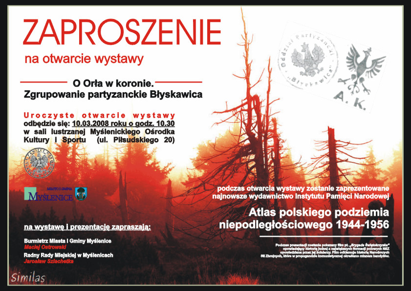 Krakowski Oddział Instytutu Pamięci Narodowej oraz Radny Rady Miejskiej w Myślenicach Jarosław Szlachetka zorganizowali promocję „Atlasu polskiego podziemia niepodległościowego 1944–1956”. W spotkaniu, nad którym honorowy patronat objął Burmistrz Miasta i Gminy Myślenice Maciej Ostrowski, udział wzięli dr hab. Zdzisław Zblewski (OIPN Kraków), Dariusz Gorajczyk (OIPN Kraków) oraz Robert Rubacha (OBL Kraków). Na spotkanie przybyli również Jan Baster – Dyrektor Generalny IPN, prokurator Jacek Wygoda – Dyrektor Biura Lustracyjnego IPN oraz Marek Łataf – poseł Prawa i Sprawiedliwości.