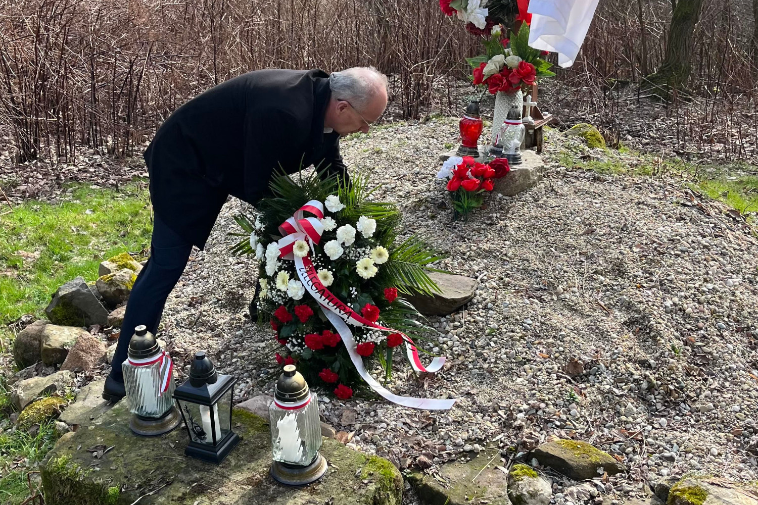 Ostatnim punktem dzisiejszych uroczystości była wizyta wiceprezesa IPN prof. Krzysztofa Szwagrzyka oraz zastępcy dyrektora Oddziału IPN we Wrocławiu Marcina Marczaka w Malerzowicach Wielkich w miejscu dawnego majątku Scharfenbergów. Tu także odnaleziono szczątki zamordowanych żołnierzy z oddziału Henryka Flamego. Przedstawiciele IPN oddali im cześć składając wieńce i zapalając znicze na symbolicznej mogile.