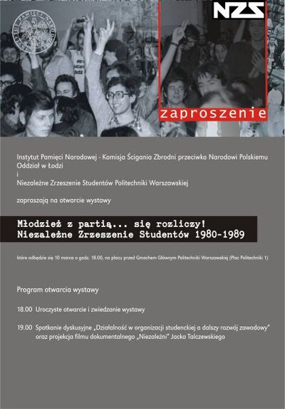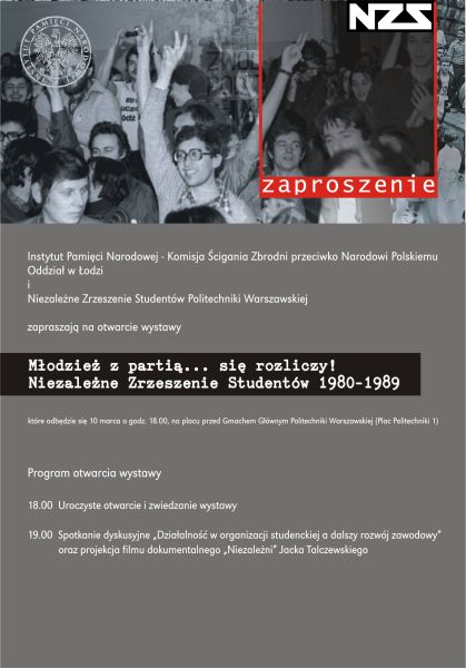 Łódzki Oddział Instytutu Pamięci Narodowej oraz Niezależne Zrzeszenie Studentów Politechniki Warszawskiej serdecznie zapraszają na wystawę „Młodzież z partią... się rozliczy! Niezależne Zrzeszenie Studentów 1980–1989”. Otwarcie wystawy miało miejsce 10 marca br. na placu przed gmachem głównym Politechniki Warszawskiej (Plac Politechniki 1).