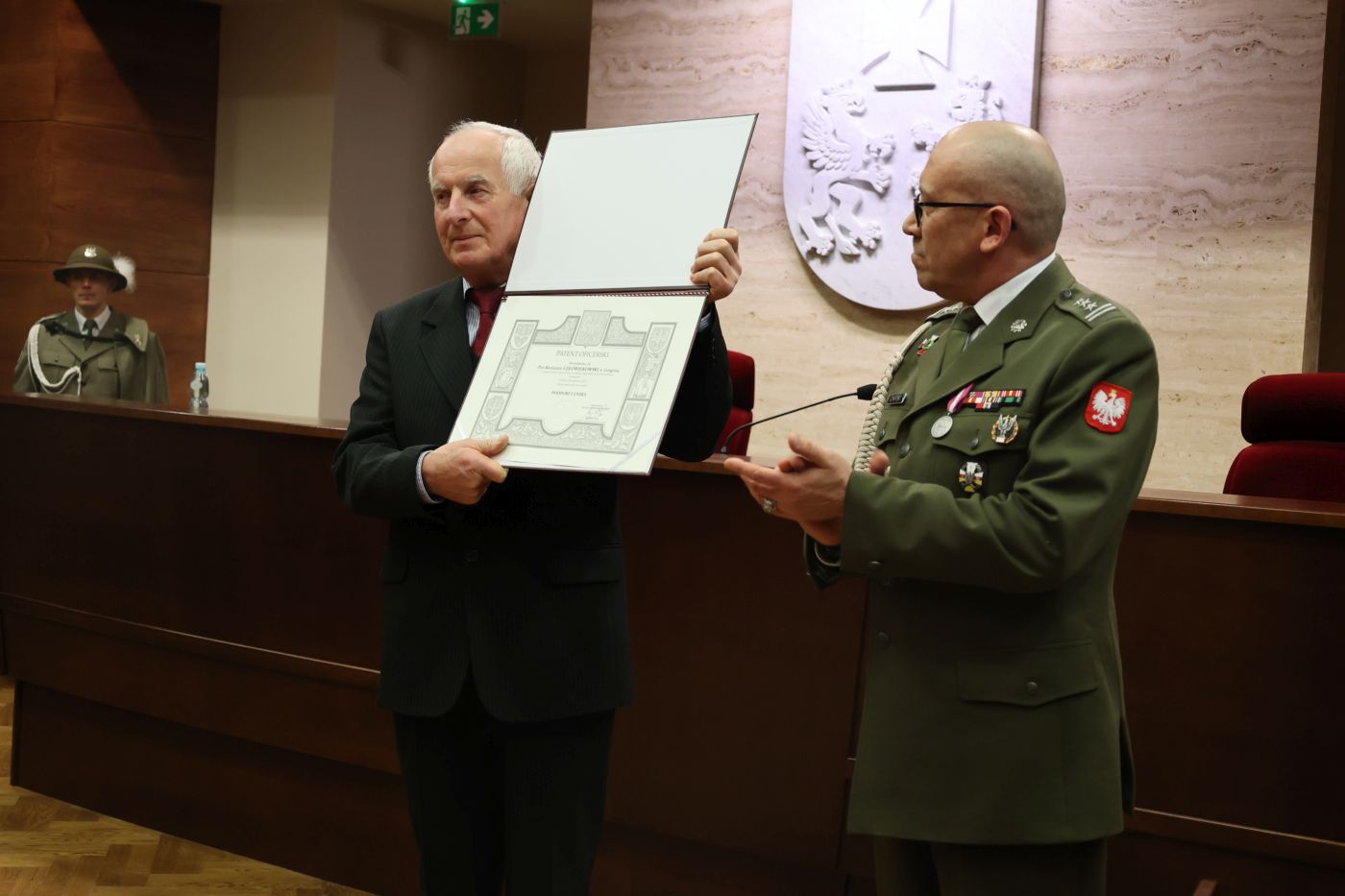 Płk Artur Chapski – szef Ośrodka Zamiejscowego w Rzeszowie CWCR i Zbigniew Człowiekowski – syn śp. Kazimierza – Rzeszów, 12 marca 2024. Fot. Katarzyna Gajda-Bator (IPN)
