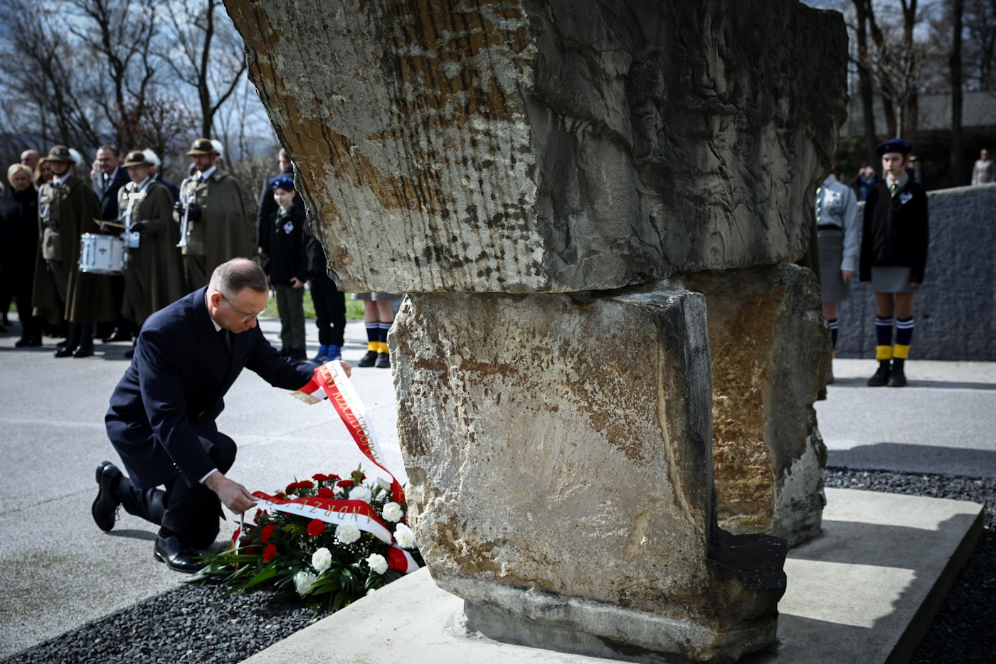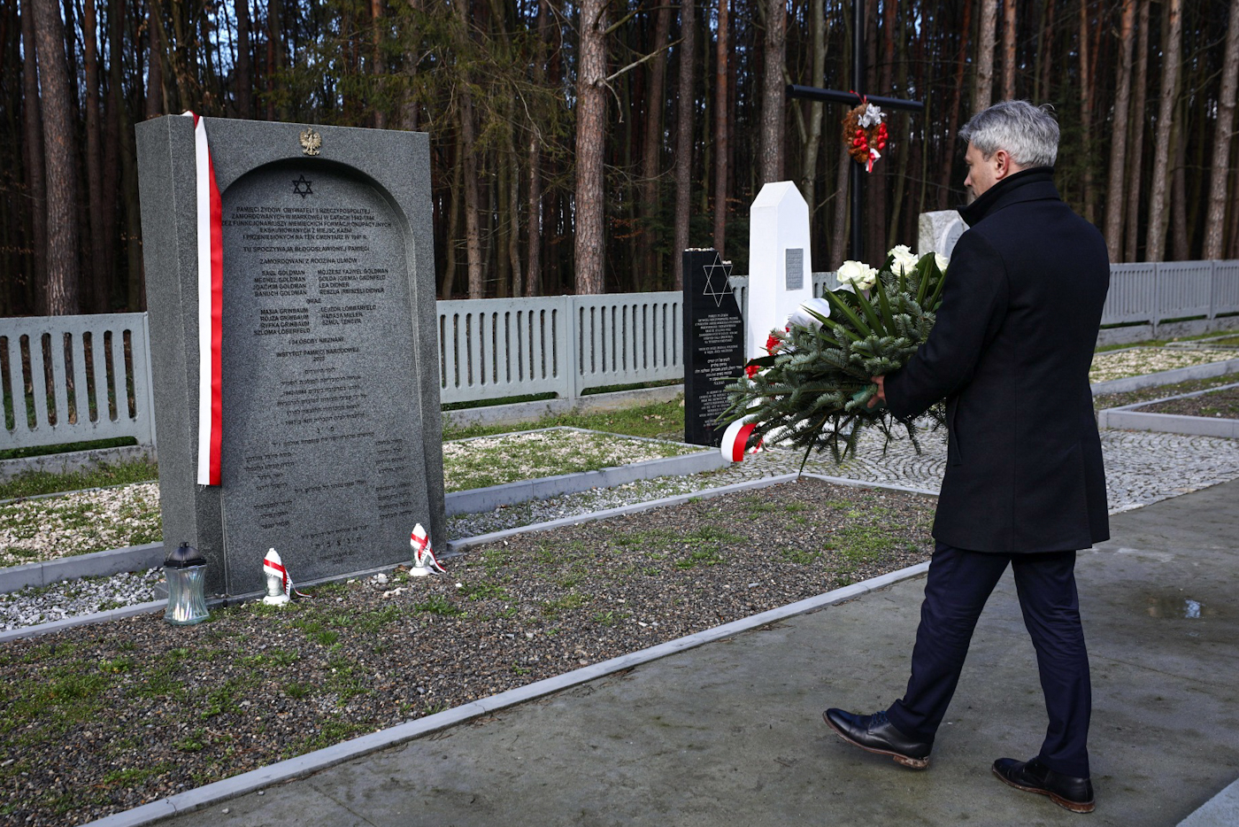 Kwiaty w imieniu prezesa IPN przed pomnikiem upamiętniające Żydów, zamordowanych w Markowej przez Niemców złożył dr Adam Pleskaczyński, dyrektor BEN IPN – 24 marca 2024. Fot. Sławek Kasper (IPN) -