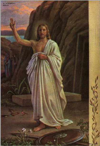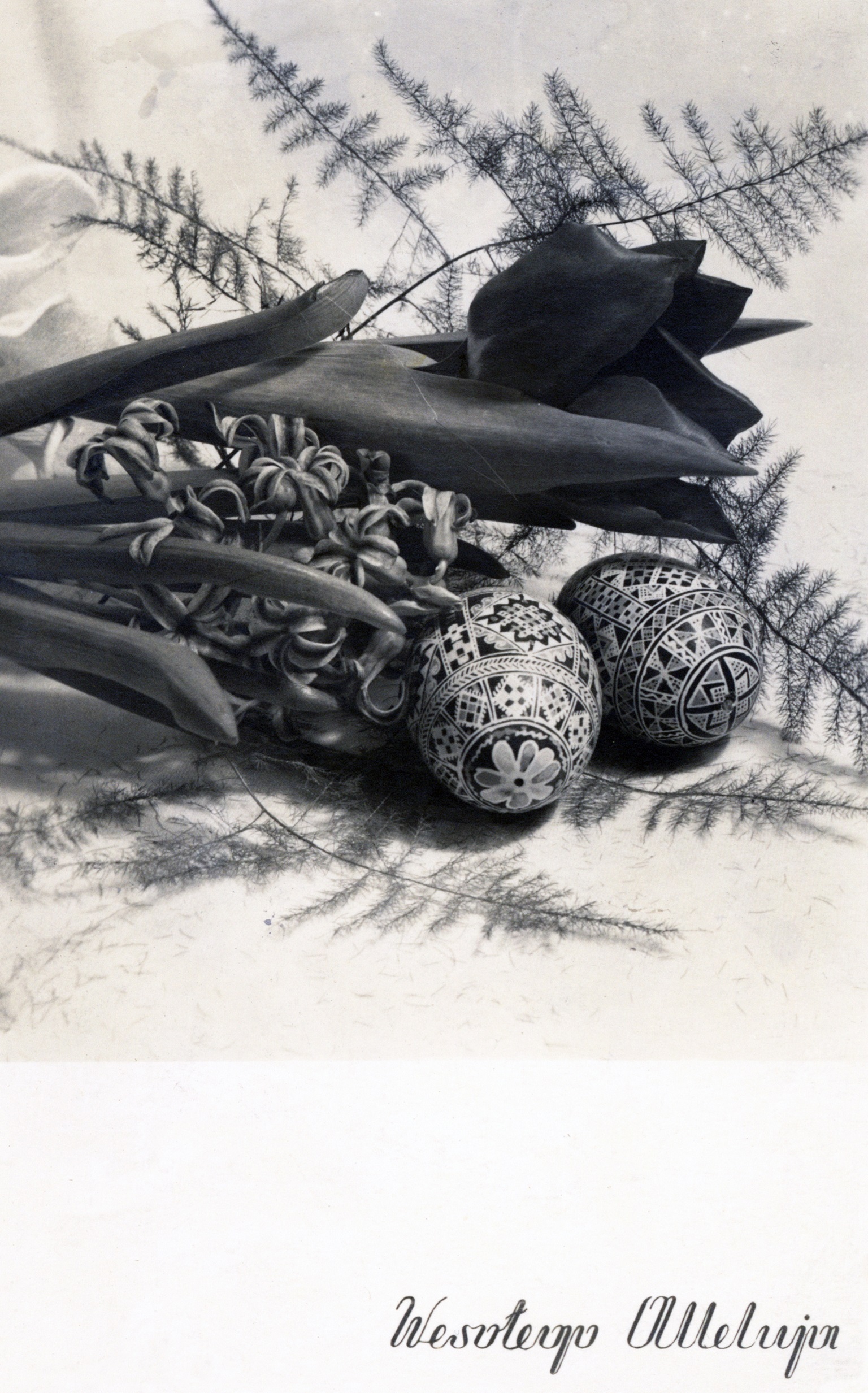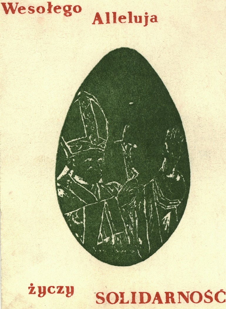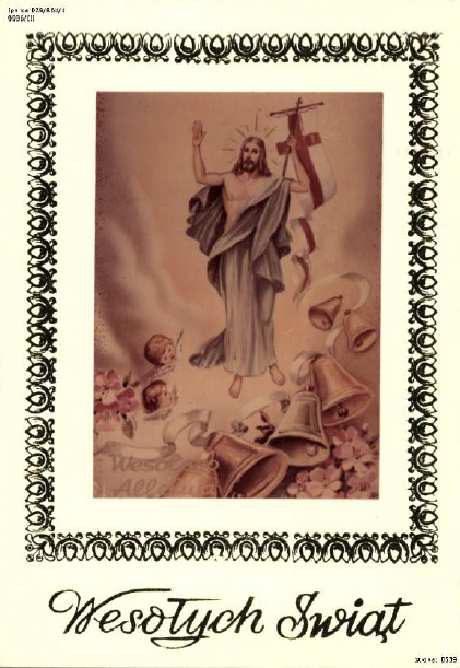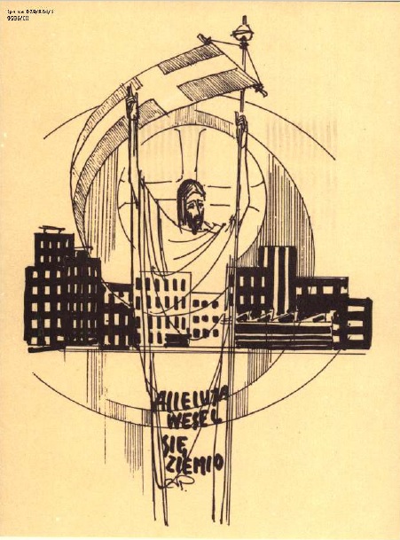 Kartka z życzeniami „przeobfitych łask od Zmartwychwstałego Chrystusa zwiastującego wielką nadzieję”, wysłana do Danuty Skorenko, przebywającej w areszcie śledczym w Katowicach za kolportaż „nielegalnych pism, ulotek i wydawnictw o treści antypaństwowej”, 1986 r. (fot. K. Piątek, wyd. Krajowa Agencja Wydawnicza; IPN Ka 029/864, t. 1) -