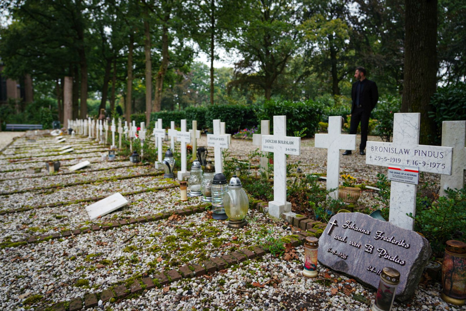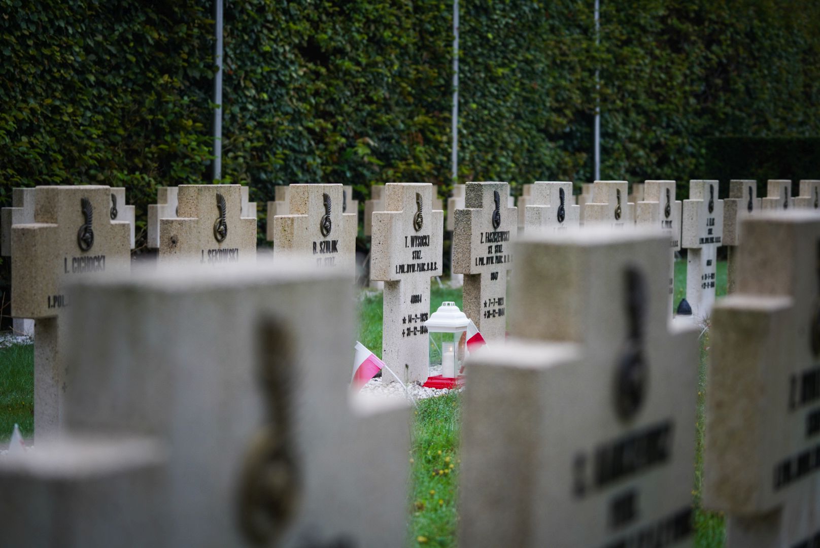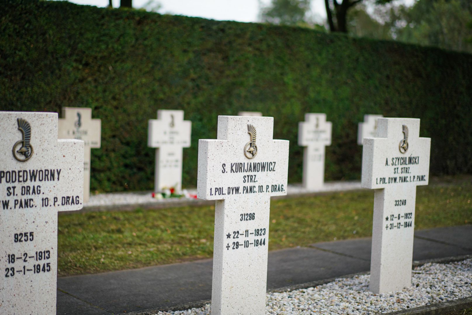 Wzdłuż alei za ścianą pamięci rozciągają się równe rzędy białych mogił – 255 krzyży oraz 2 tablice z wyrytą Gwiazdą Dawida. Cmentarz, założony w 1946 roku z inicjatywy władz brytyjskich, jest miejscem spoczynku polskich żołnierzy, którzy polegli podczas wyzwalania Belgii spod niemieckiej okupacji. Szczątki poległych zostały przeniesione tu z różnych części kraju, aby oddać im należny hołd.