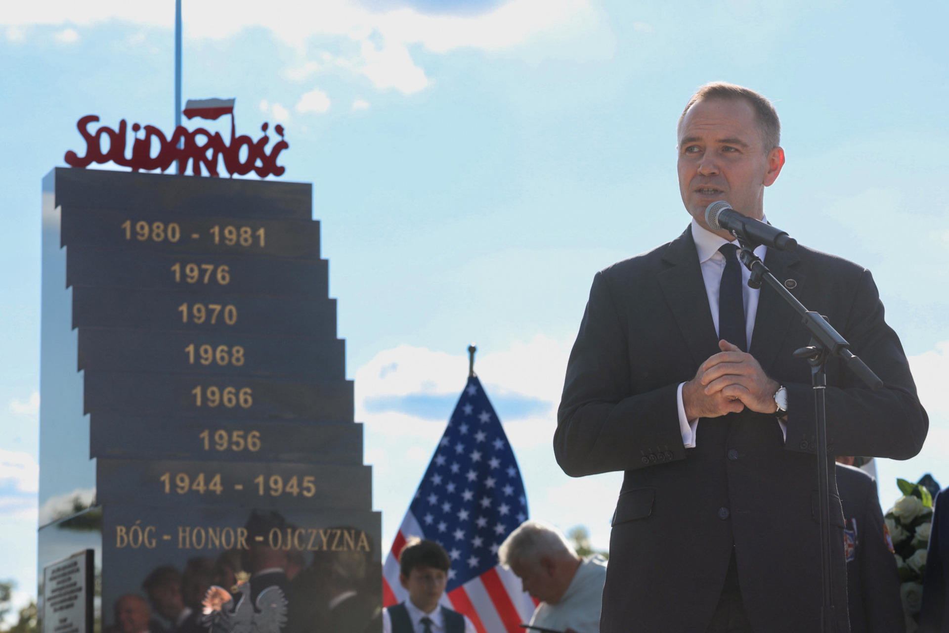 Poświęciliśmy pomnik Bohaterów „Walki o Niepodległość po 1944–45 roku i »Solidarności«”. Na zdj. prezes IPN dr Karol Nawrocki – Doylestown (Pensylwania, Stany Zjednoczone), 22 września 2024. Fot. Mikołaj Bujak (IPN) -
