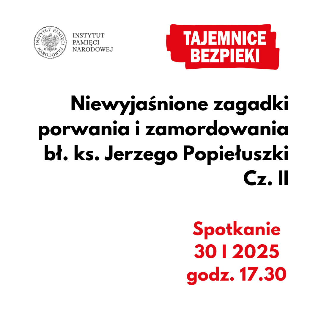 Jakie tajemnice kryje brutalne morderstwo kapelana Solidarności? Dlaczego mimo oficjalnych ustaleń sprawa ks. Jerzego Popiełuszki wciąż budzi tyle pytań i kontrowersji? Podczas spotkania przyjrzymy się śladom, które mogły zostać zatuszowane, i poszukamy odpowiedzi na pytania, które od lat nurtują historyków i społeczeństwo. Kto naprawdę ponosi odpowiedzialność za śmierć bł. ks. Jerzego Popiełuszki? Czy była to tylko grupa funkcjonariuszy SB, czy może sprawa sięga wyżej, aż do ówczesnej władzy? Poznaj kulisy jednego z najgłośniejszych morderstw.