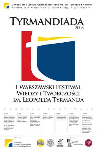 - 10.00 Wykład Konrada Rokickiego z Oddziałowego Biura Edukacji Publicznej IPN w Warszawie „Legenda Tyrmanda” (Gimnazjum i Liceum Ogólnokształcące im. św. Tomasza z Akwinu)