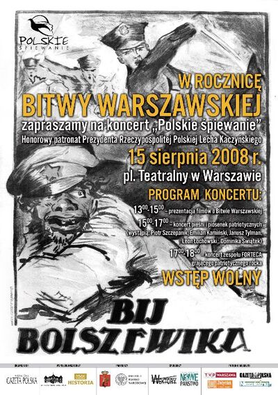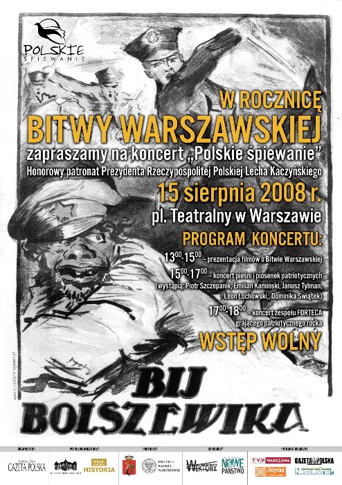Instytut Pamięci Narodowej, Niezależna Gazeta Polska, TVP Historia, Muzeum Niepodległości, Miasto Stołeczne Warszawa zapraszają z okazji 88. rocznicy Bitwy Warszawskiej na koncert "Polskie śpiewanie". Koncert odbędzie się 15 sierpnia br. o godz. 15.00 na warszawskim Placu Teatralnym Podczas koncertu, w którym udział wezmą m.in. Piotr Szczepanik, Emilian Kamiński, Janusz Tylman, Leon Łochowski i Dominika Świątek, wykonane zostaną tradycyjne pieśni patriotyczne i przedwojenne szlagiery.