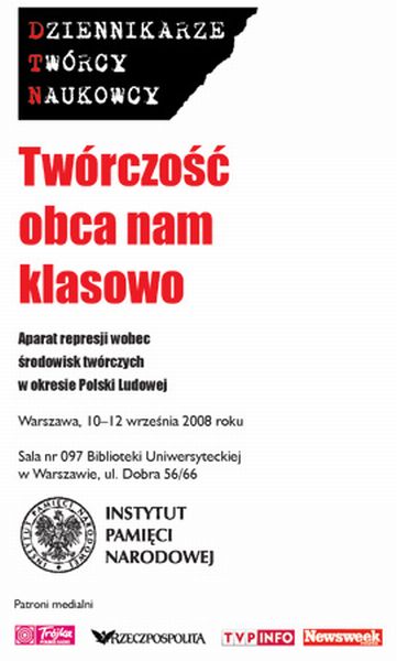 „Twórczość obca nam klasowo…” – pod takim tytułem, zaczerpniętym z wniosku o wszczęcie sprawy założonej przez Służbę Bezpieczeństwa na krakowski oddział Związku Literatów Polskich, odbyła się w Warszawie, w dniach 10–12 września br. konferencja naukowa poświęcona wzajemnym relacjom środowisk twórczych i aparatu represji w okresie PRL. Konferencja została zorganizowana przez Instytut Pamięci Narodowej w ramach projektu badawczego Biura Edukacji Publicznej „Aparat bezpieczeństwa wobec środowisk twórczych, naukowych i dziennikarskich”. Do udziału w spotkaniu zaproszono m.in. historyków sztuki, filmoznawców oraz samych twórców.