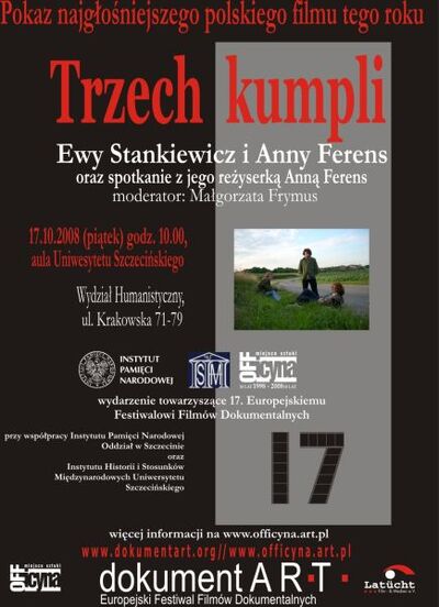 Jak zginął Pyjas? Na ile donosy Maleszki przyczyniły się do jego prześladowania? Co wydarzyło się w nocy z 6 na 7 maja ponad 30 lat temu? „Trzech kumpli” – pokaz specjalny najgłośniejszego polskiego filmu tego roku Ewy Stankiewicz i Anny Ferens odbył się 17 października 2008 r. w auli Uniwersytetu Szczecińskiego przy ul. Krakowskiej 71-79. W pokazie wzięła udział reżyser Anna Ferens. Wydarzenie towarzyszyło 17. Europejskiemu Festiwalowi Filmów Dokumentalnych i zostało zorganizowane we współpracy Instytutu Pamięci Narodowej Oddział w Szczecinie, Instytutu Historii i Stosunków Międzynarodowych Uniwersytetu Szczecińskiego oraz galerii Miejsce Sztuki Officyna.