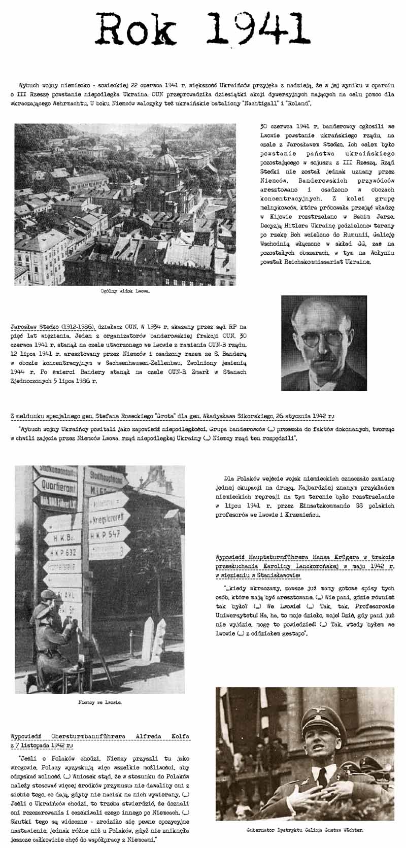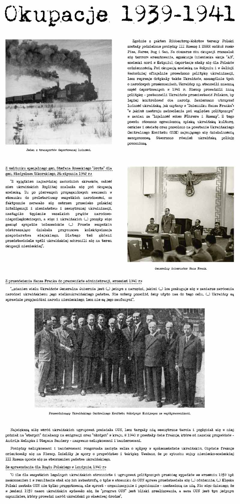 Wystawa porusza wiele bolesnych problemów: postawę Ukraińców we wrześniu 1939 r., politykę narodowościową okupantów niemieckiego i sowieckiego, którzy polsko-ukraińskie napięcia starali się wykorzystać do własnych celów, losy dywizji SS "Hałyczyna", działalność polskiego i ukraińskiego podziemia, wreszcie chyba najbardziej bolesne dla Polaków i Ukraińców wydarzenia dotyczące antypolskiej akcji Organizacji Ukraińskich Nacjonalistów - Ukraińskiej Powstańczej Armii (OUN-UPA) z lat 1943-1944 na Wołyniu i w Galicji Wschodniej oraz operacji "Wisła" w 1947 r.
