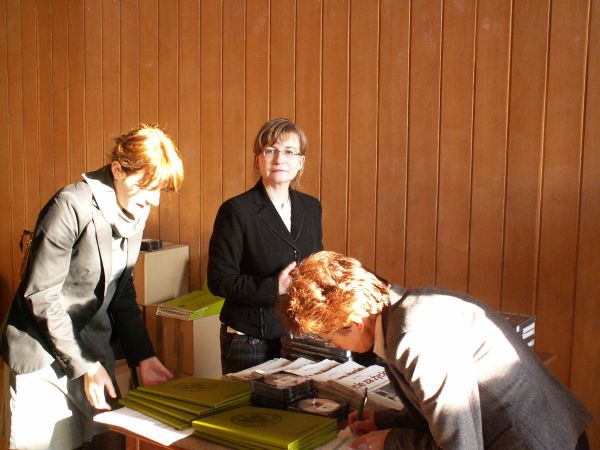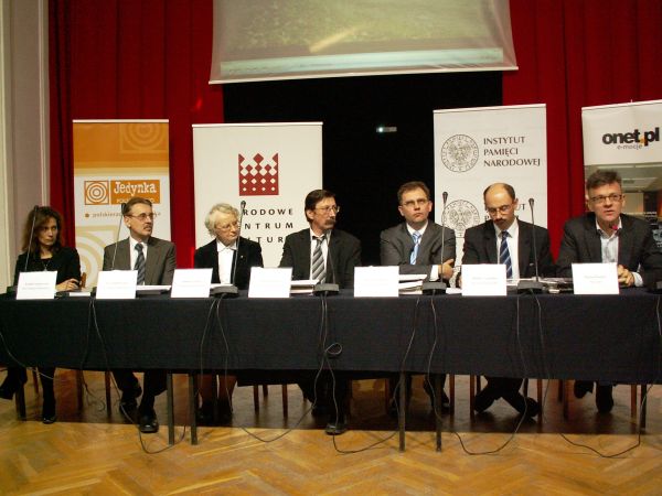 Fot. 2 – Prelegenci, występujący podczas prezentacji. Od lewej: Kamila Sachnowska (BEP IPN), Krzysztof Fischer (profesor historii w LO Batorego), Joanna Cichocka (dyrektor LO Batorego), dr hab. Jan Żaryn (dyrektor BEP IPN), Krzysztof Dudek (dyrektor Narodowego Centrum Kultury), autor książki o rodzinie Ulmów zamordowanej za ratowanie Żydów Mateusz Szpytma (zastępca Dyrektora Sekretariatu Prezesa IPN), producent szykowanego na 2009 rok filmu o, także zamordowanych za pomoc udzielaną Żydom, rodzinie Kowalskich Maciej Pawlicki.