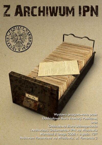 W dniu 8 lutego br. w sali wystawowej Archiwum Państwowego we Wrocławiu odbył się wernisaż wystawy wrocławskiego Instytutu Pamięci Narodowej – „Z Archiwum IPN”. Ekspozycja została przygotowana przez Oddziałowe Biuro Edukacji Publicznej i Oddziałowe Biuro Udostępniania i Archiwizacji Dokumentów IPN we Wrocławiu.