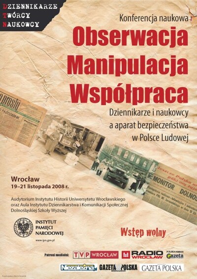 W dniach 19–21 listopada 2008 r. we Wrocławiu odbyła się konferencja naukowa „Obserwacja, manipulacja, współpraca. Dziennikarze i naukowcy a aparat bezpieczeństwa w Polsce Ludowej”. Była ona podsumowaniem dotychczasowych badań realizowanych przez członków projektu „Aparat bezpieczeństwa wobec środowisk twórczych, dziennikarskich i naukowych” prowadzonego przez Biuro Edukacji Publicznej Instytutu Pamięci Narodowej.