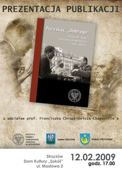 Instytut Pamięci Narodowej Oddział w Rzeszowie zorganizował wspólnie z Gminą i Powiatem Strzyżowskim prezentację książki „Pozyskać »Dobrego«. Wywiad PRL wobec Franciszka Chrapkiewicza i jego rodziny”, pod red. Anny Fary, Piotra Szopy i Roberta Witalca. Prezentacja odbyła się 12 lutego 2009 r. w Strzyżowie – w Domu Kultury „Sokół”, ul. Mostowa 2. Na prezentacji książki w Strzyżowie obecny był profesor Franciszek Chrapkiewicz – główny bohater opisywanych w publikacji wydarzeń.