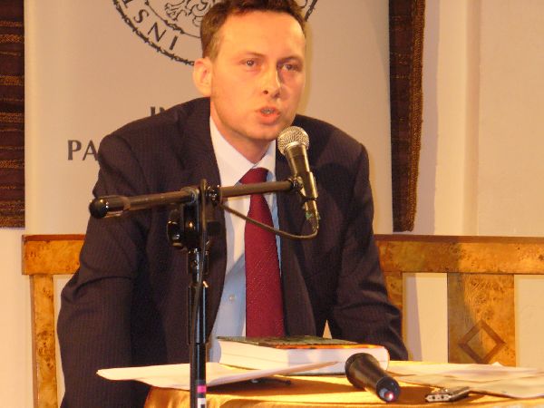 Kolejnym punktem spotkania było wystąpienie autora publikacji, Mariusza Bechty, pracownika Oddziałowego Biura Edukacji Publicznej IPN w Warszawie, który przedstawił główne tezy publikacji oraz genezę jej powstania „Ta książka to efekt ponad dziesięciu lat badań, kontaktów z żołnierzami Narodowych Sił Zbrojnych, rodzinami działaczy Stronnictwa Narodowego. Dzisiejsze spotkanie to dla mnie zwieńczenie moich poszukiwań”. Autor podkreślił, że istotnym aspektem książki, który wpłynął również na jej tytuł, jest fakt, że „Narodowe Siły Zbrojne, które formalnie powstały 20 września 1942 roku, do końca okupacji niemieckiej konsekwentnie stały na stanowisku, że Polska nie ma jednego, lecz dwóch wrogów, bez wartościowania, który jest »lepszy«, a który »gorszy«. Na równi traktowały zarówno narodowo-socjalistyczne Niemcy jak i sowiecką Rosję, wspieraną przez ekspozyturę PPR. Ten pragmatyzm politycznego myślenia narodowców wypływał z krótkiego acz bardzo burzliwego okresu istnienia państwa polskiego przed 1939 rokiem”.