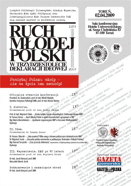 Konferencja naukowa „Ruch Młodej Polski. W trzydziestolecie Deklaracji Ideowej 1979–2009” zorganizowana została przez Instytut Politologii Uniwersytetu Mikołaja Kopernika, Studenckie Koło Myśli Politycznej oraz Interdyscyplinarne Koło Naukowe Doktorantów UMK pod patronatem Instytutu Pamięci Narodowej i Marszałka Województwa Kujawsko-Pomorskiego. Odbyła się 2 kwietnia 2009 r. w sali konferencyjnej Hotelu Uniwersyteckiego w Toruniu. Jej celem była prezentacja intelektualnego dorobku Ruchu Młodej Polski, a także przybliżenie specyfiki jego działalności oraz dokonań. Konferencja wpisała się w ogólnopolską rocznicę trzydziestolecia organizacji, która przez wielu uznawana jest za jedną z aktywniejszych intelektualnie w swoich czasach. Na konferencję złożyły się trzy panele: pierwszy dotyczył historii Ruchu Młodej Polski, drugi – kwestii ideowych, natomiast trzeci miał charakter wspomnieniowy. Obecni byli liderzy Ruchu: dr hab. Jacek Bartyzel oraz Marszałek Marek Jurek, a także m.in. prof. Wojciech Polak, dr Wojciech Turek i Konrad Turzyński.