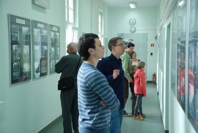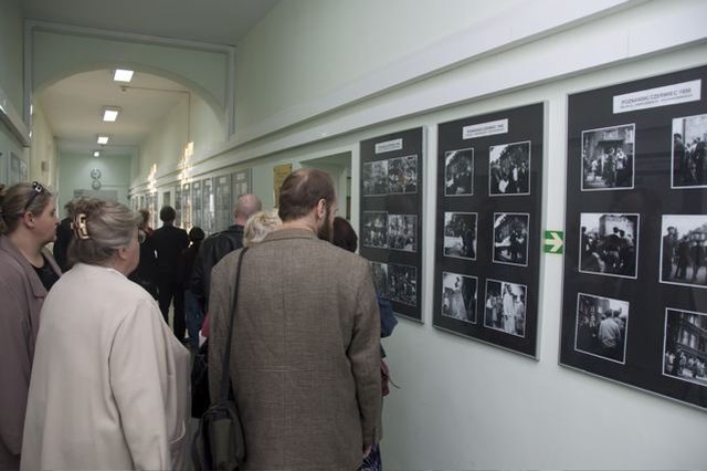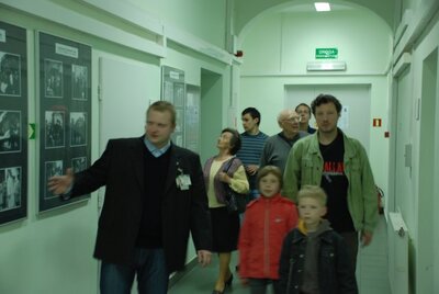 Z soboty na niedzielę, tj. z 16 na 17 maja w godz. od 18:00 do 1:00 poznański oddział IPN uczestniczył w ogólnopolskiej akcji Noc Muzeów. Pierwsi zainteresowani goście zjawili się już o godz. 17.00. Zwiedzanie rozpoczęło się zgodnie ze scenariuszem od godz. 18:00 od wejścia kikunastoosobowej grupy, którą przyjął pracownik oddziału dyżurujący w punkcie informacyjnym. Zwiedzający otrzymali od niego krótka informację o zasadach poruszania się po oddziale i kolejnych etapach zwiedzania. Następnie przekazał grupę osobie oprowadzającej według ustalonego scenariusza (fot. 1 ). I tak wszystkie kolejne grupy, a było ich ponad dwadzieścia, odwiedzały stałą wystawę fotografii z zasobów IPN o poznańskim zrywie wolnościowym z Czerwca 1956 r. (fot. 2, 3, 4). Osoby oprowadzające podkreślały w swoich komentarzach, że prezentowane zdjęcia zostały zrobione przez utajnionych funkcjonariuszy UB specjalnymi ukrytymi aparatami i że wystawę tych zdjęć można zobaczyć tylko w poznańskim oddziale IPN.