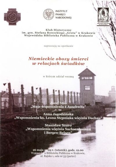 26 maja 2009 r. o godz. 12.00 w Wojewódzkiej Bibliotece Publicznej w Krakowie przy ul. Rajskiej 1 miało miejsce spotkanie Klubu Historycznego im. gen. Stefana Roweckiego „Grota”. Tematem kolejnego w tym roku spotkania były „Niemieckie obozy śmierci w relacjach świadków”. O swoich obozowych przeżyciach opowiedzieli: Józef Stós, który 14 czerwca 1940 r. został wywieziony pierwszym transportem do KL Auschwitz, gdzie otrzymał numer 752, oraz Stanisław Szuro, który spędził 3 lata w różnych obozach, m.in. w Sachsenhausen-Oranienburg oraz Bergen-Belsen. Historię ks. kanonika Leona Stępniaka, więźnia Dachau w latach 1940–1945, przedstawiła Anna Jagodzińska z Biura Udostępniania i Archiwizacji Dokumentów IPN-KŚZpNP w Warszawie.